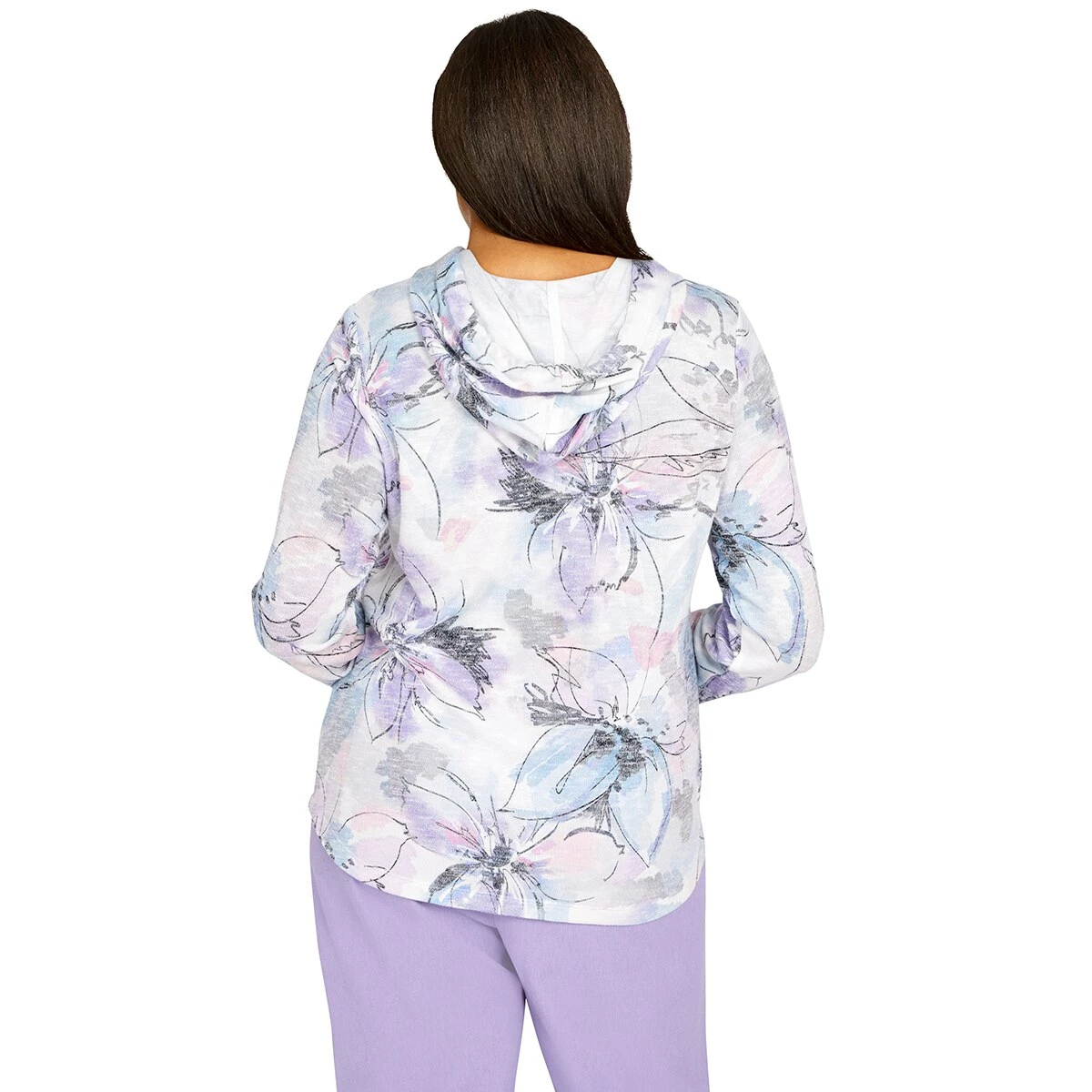 Layer on with this Petite Alfred Dunner Victoria Falls beautifully shimmered floral print hoodie. Features long sleeves, a kangaroo pocket, and a shirttail hemline.
