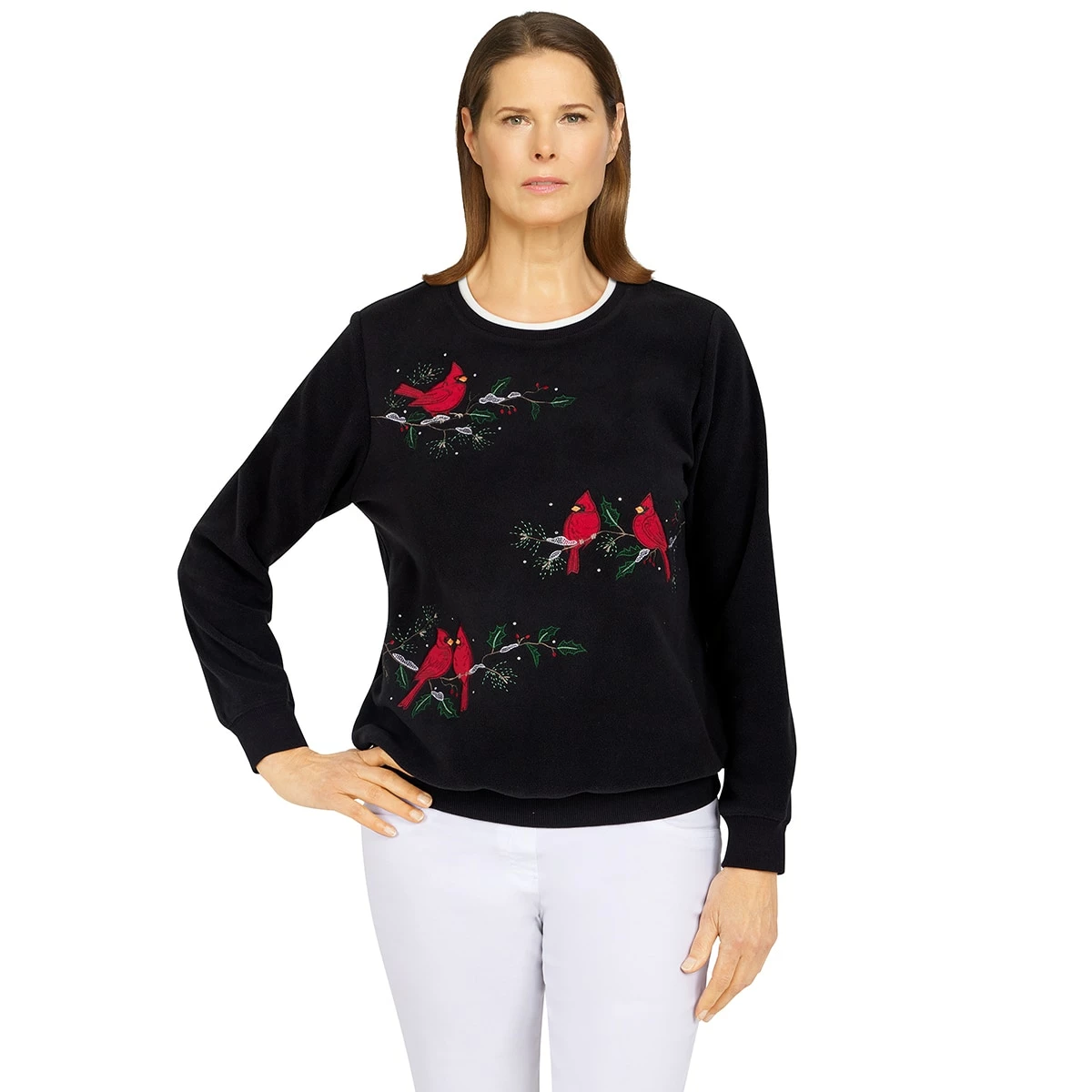 Fill your holiday spirit with this Womens Alfred Dunner Classics collection cardinals anti-pill knit pullover sweatshirt. Intricate embroidery, beading, and applique along with a double crew neckline and ribbed knit trim, make this style a wardrobe staple.