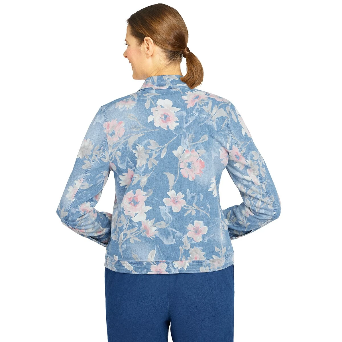 We dressed up our Womens Alfred Dunner Shenandoah Valley casual denim jacket with beautiful painterly florals. Features long sleeves and a collared neckline.