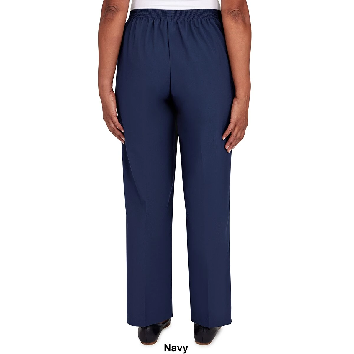 The Petites Size Alfred Dunner Picture Perfect classic fit short length pant is designed in a microfiber twill fabric with a flat-front waistband, elastic back, and side seam pockets.