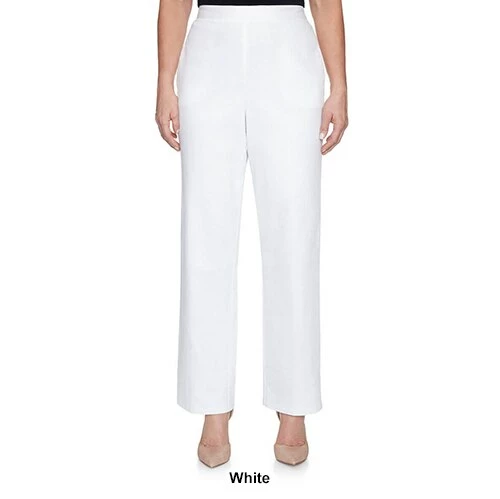 Plus Size Alfred Dunner Allure short length pants are solid with a slimming contour waistband and two pockets. 27 inch inseam. 77% Rayon, 20% Nylon, 3% Spandex. Machine wash. Line dry.