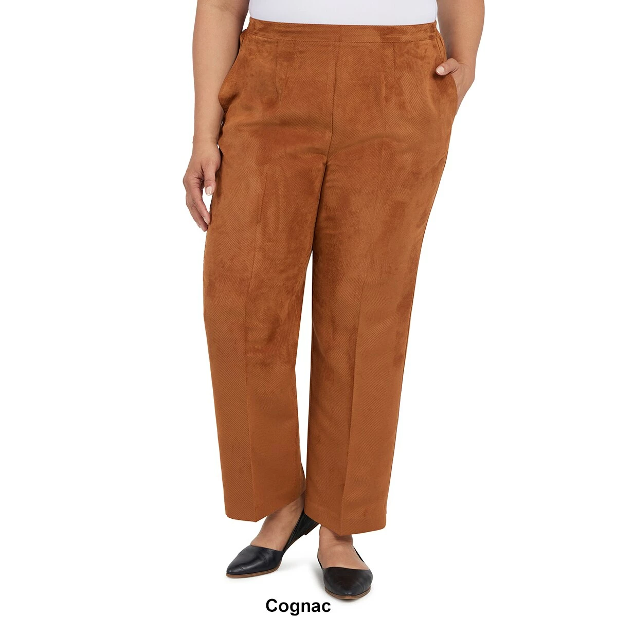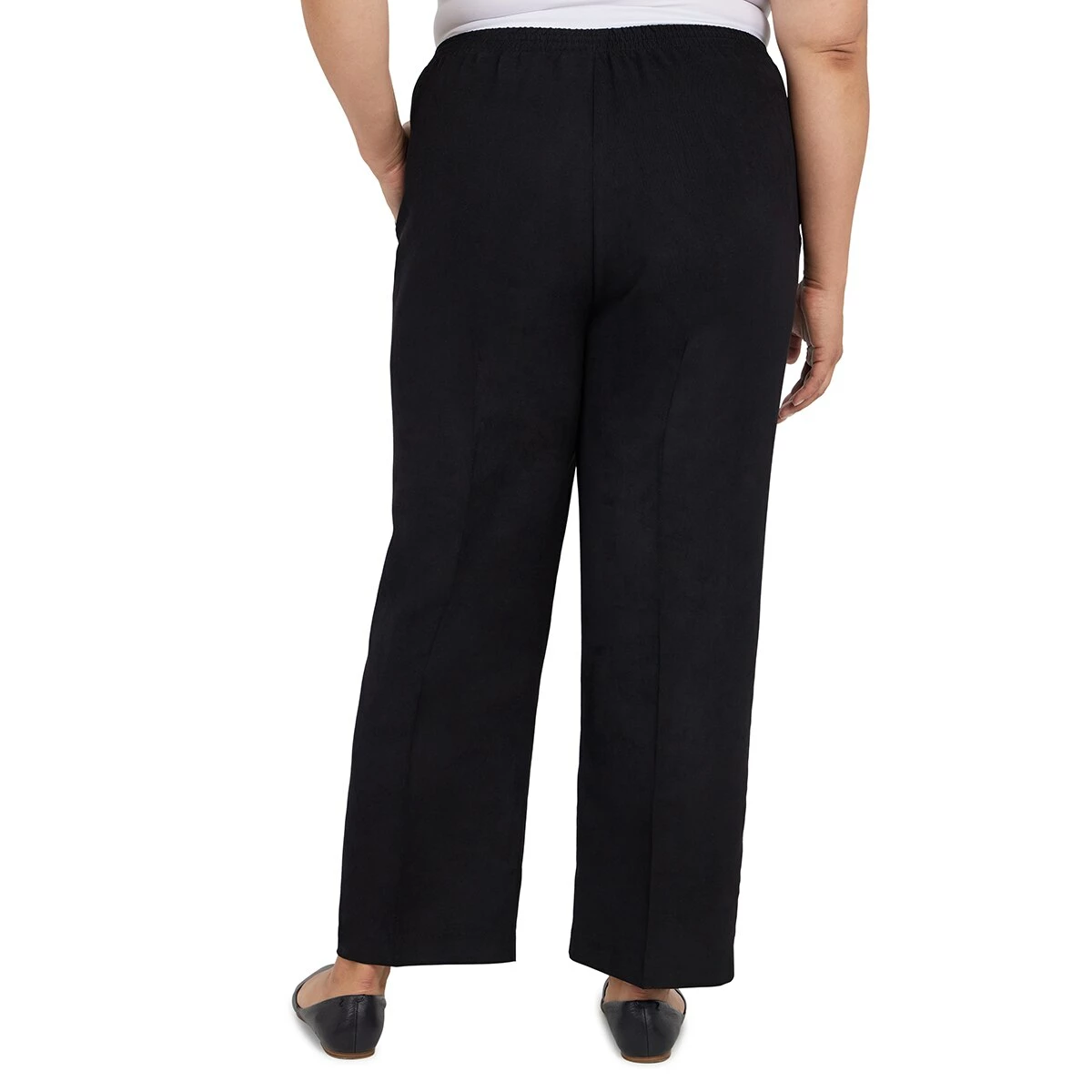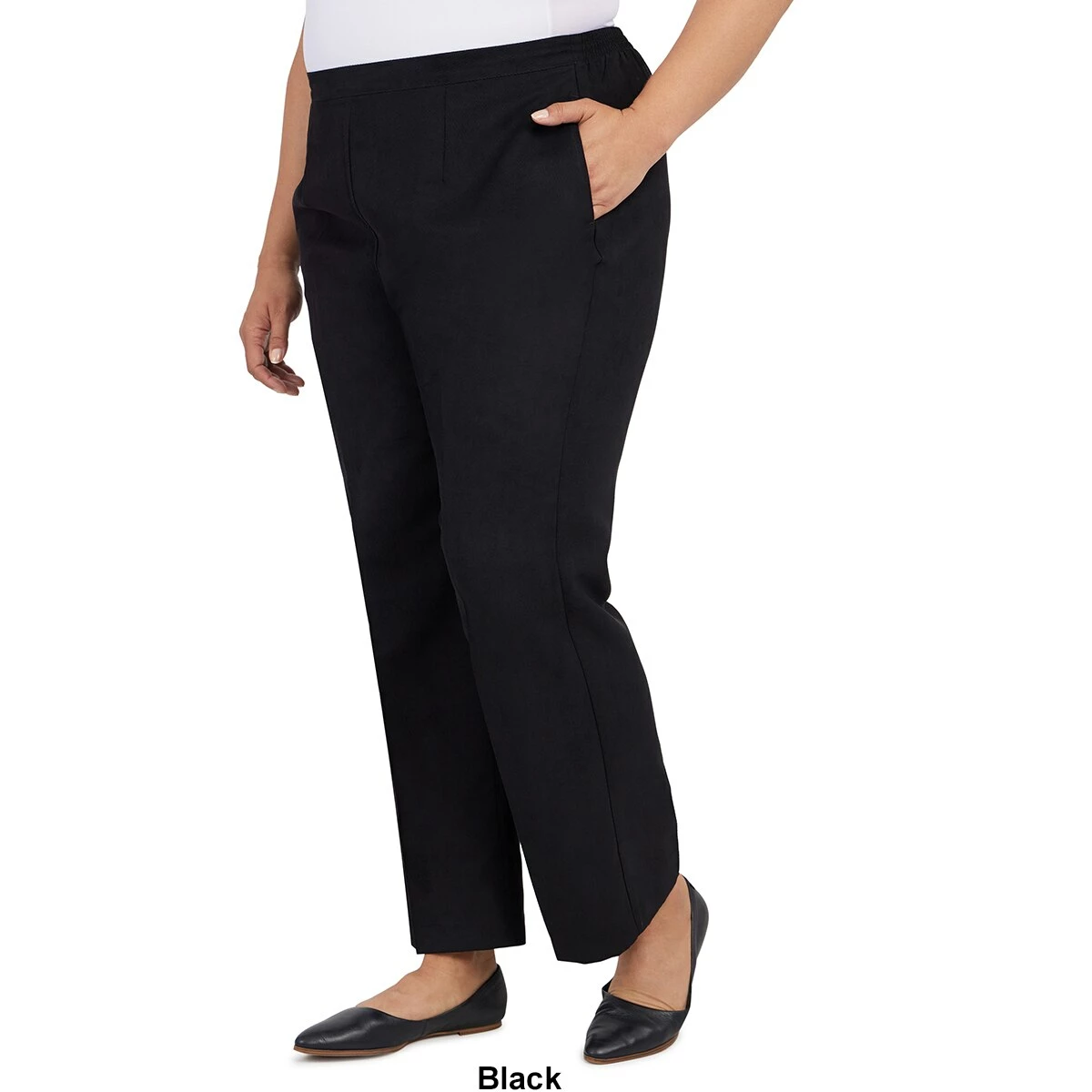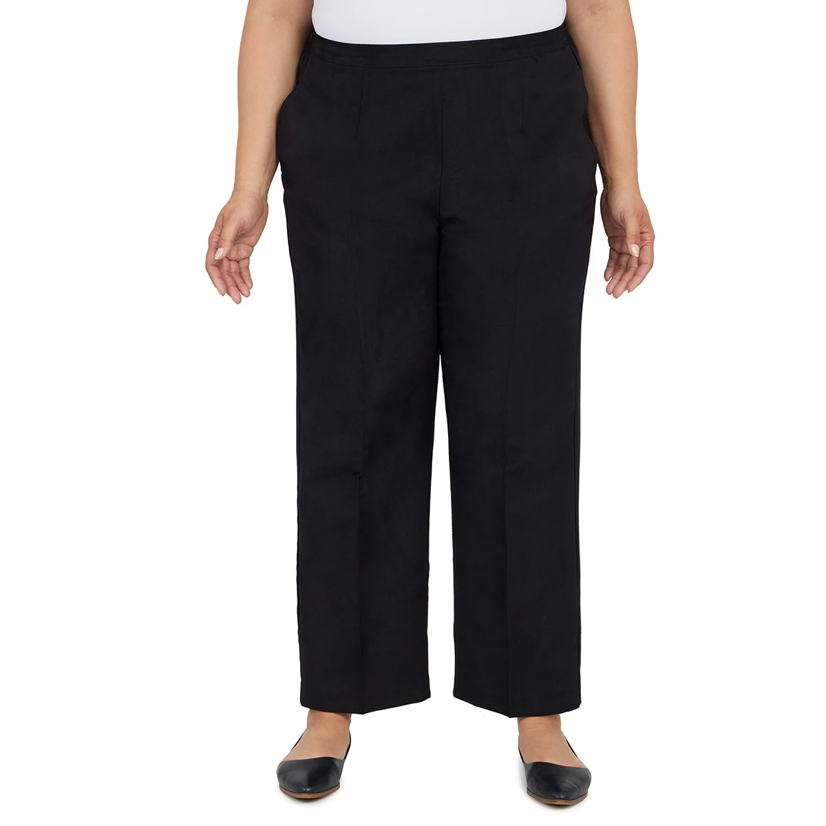 Our Plus Size Alfred Dunner Madagascar classic fit pants are tailored in a soft twill, fabric with a flat front waistband, elastic back, and side seam pockets-medium length.