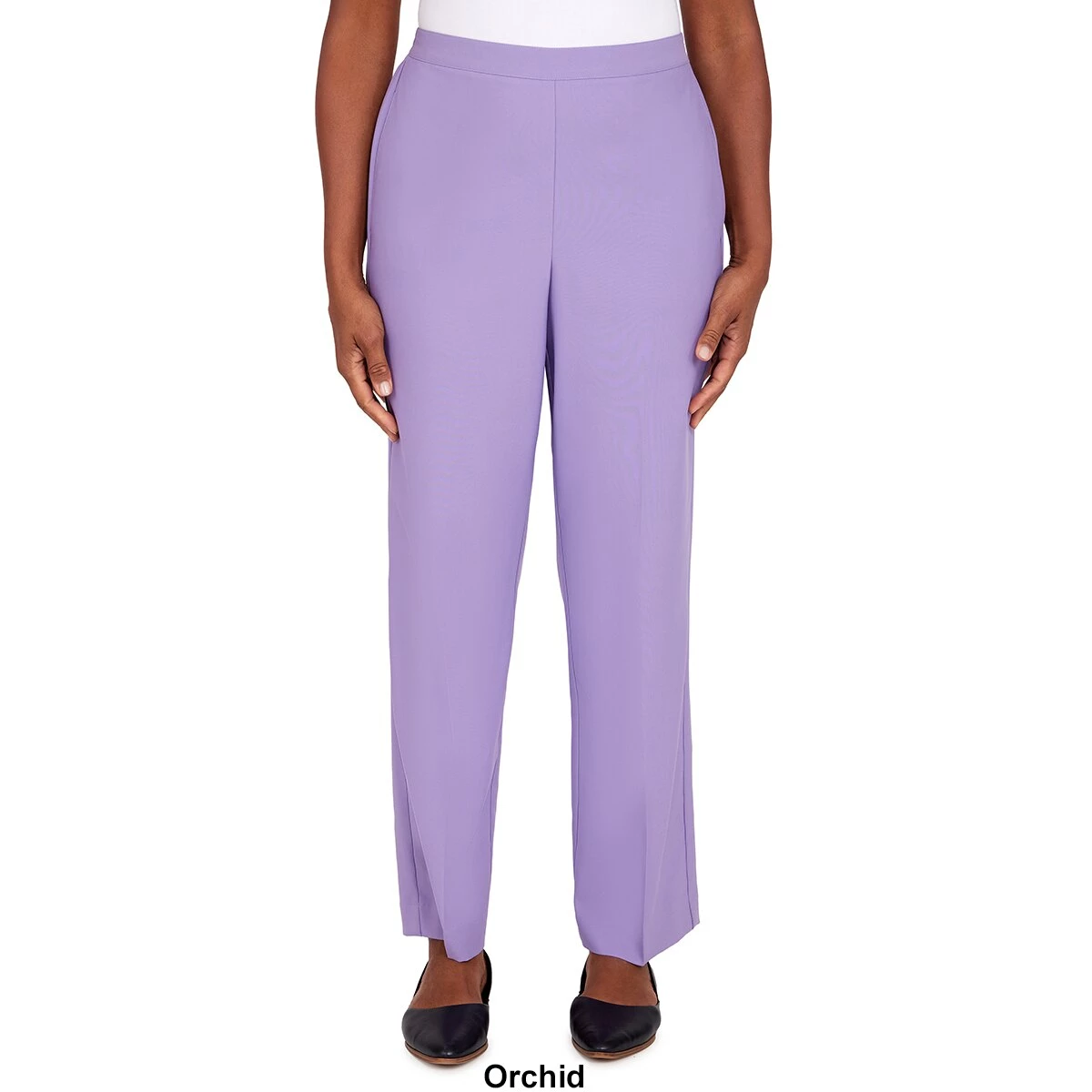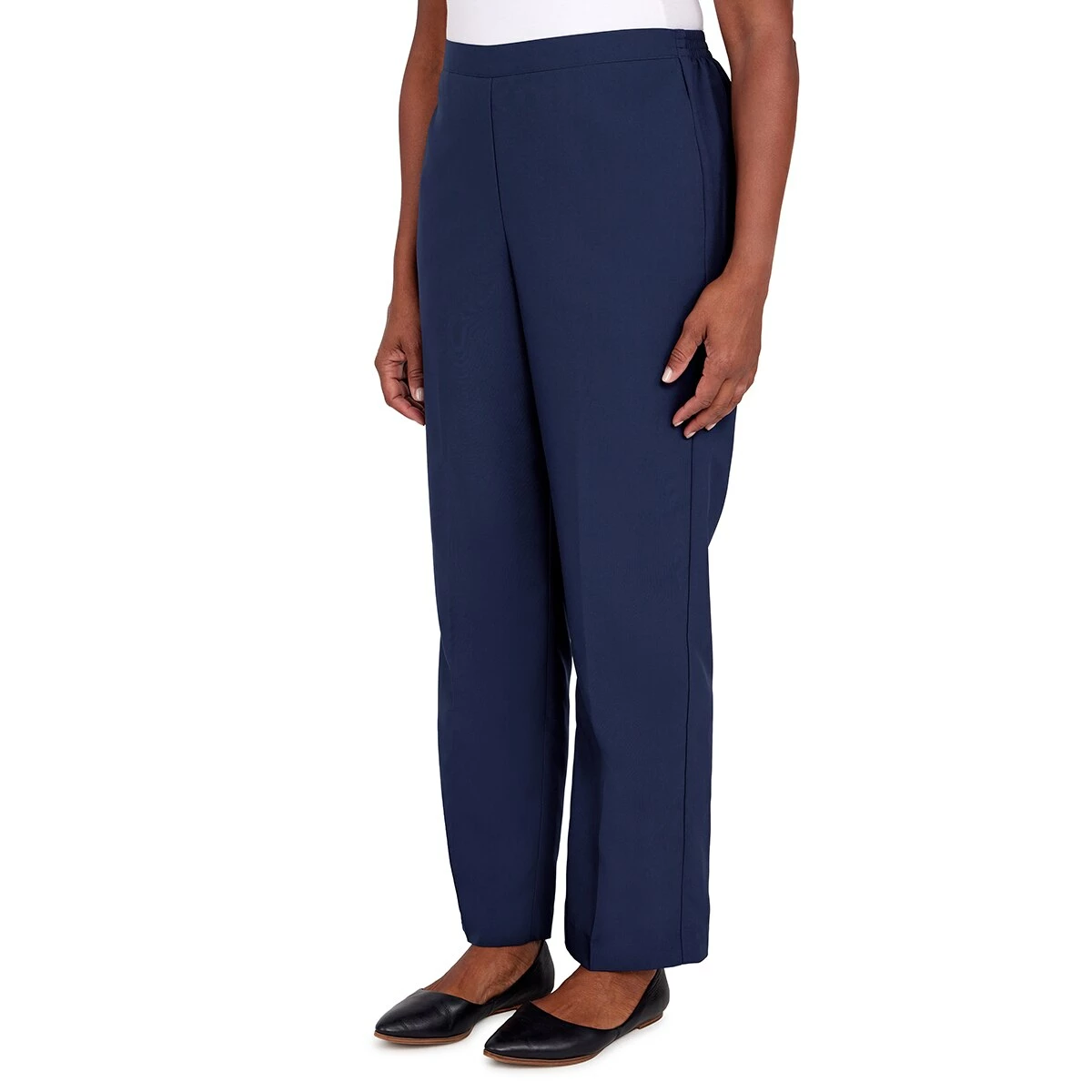 The Plus Size Alfred Dunner Picture Perfect classic fit short length pant is designed in a microfiber twill fabric with a flat-front waistband, elastic back, and side seam pockets.