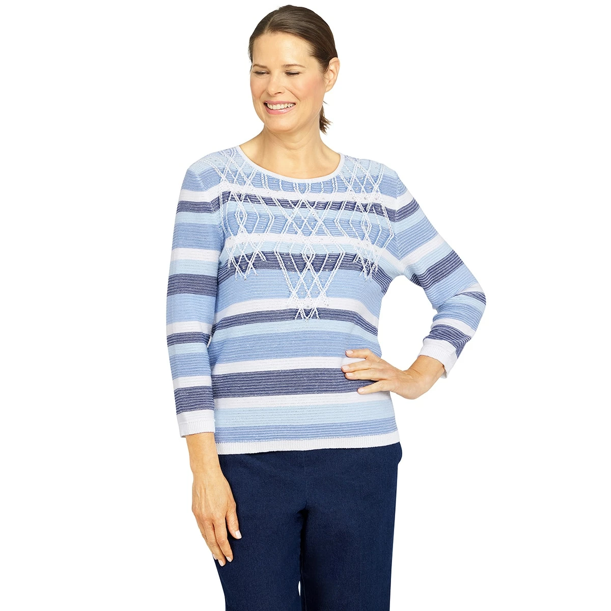 You’ll want to reach for our Petite Alfred Dunner Shenandoah Valley striped sweater for those cool fall evenings. Features unique stitch details and light beading, 3/4 sleeves, and a crew neck.
