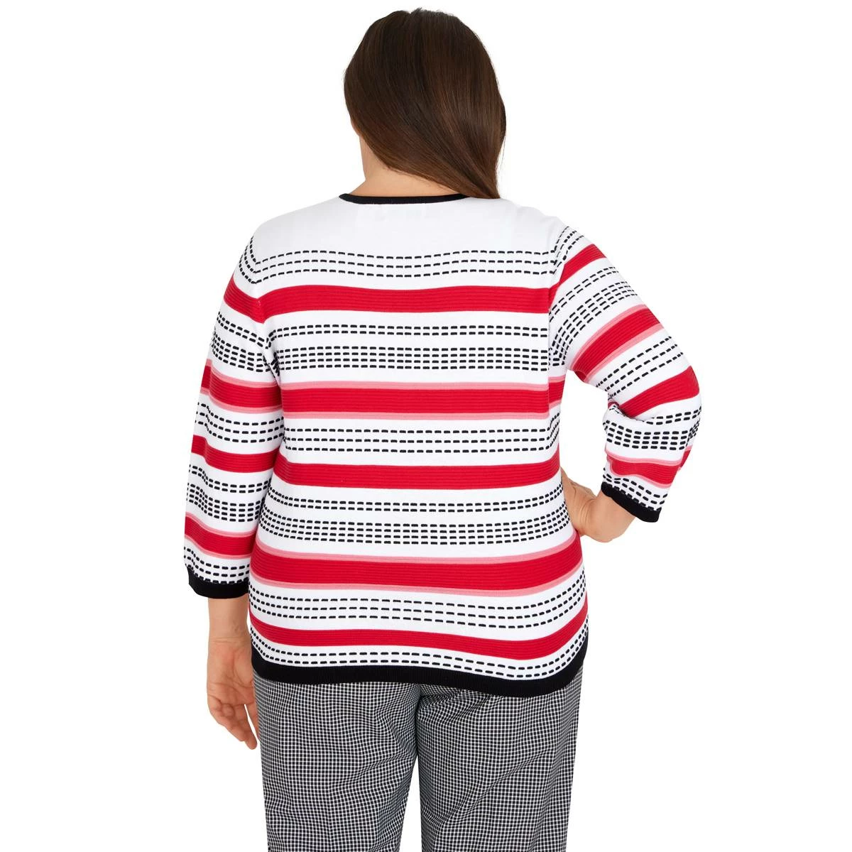 Our Plus Size Alfred Dunner Checking In gorgeous chevron print sweater is designed with a unique texture and figure-flattering asymmetrical hemline.