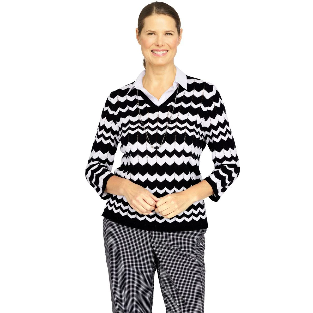 Expect the unexpected in our Womens Alfred Dunner Checking In sweater. Gives the appearance of two garments in one, and is topped off with a trendy necklace.