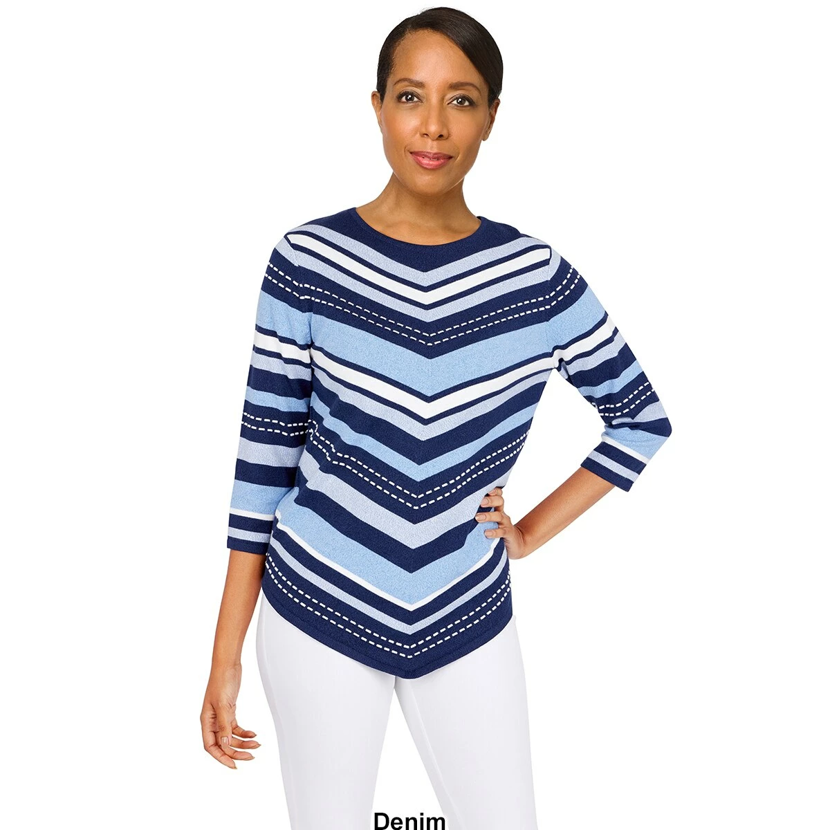 The Womens Alfred Dunner Classics collection chevron sweater is designed with a unique texture that’s perfect for cooler days. This lightweight style features 3/4 sleeves, crew neckline, and a figure-flattering v-shaped hem.