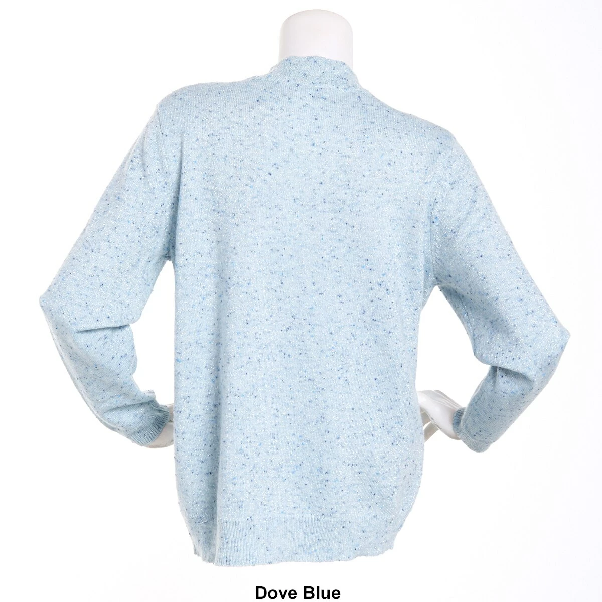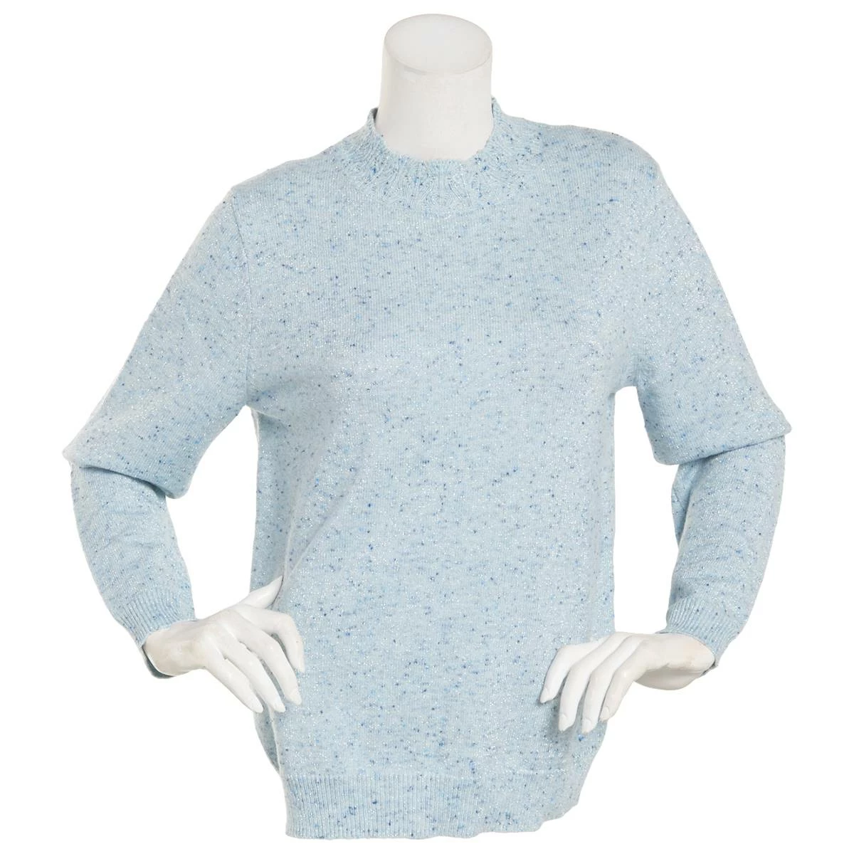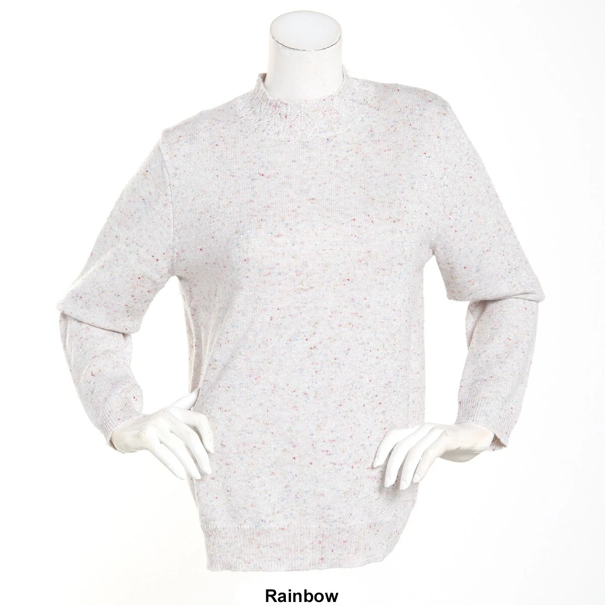 Casual or career this Womens Alfred Dunner Classics cashmelon metallic speckled sweater features a mock neckline and scallop trim at the neck, adding feminine flair with long sleeves.