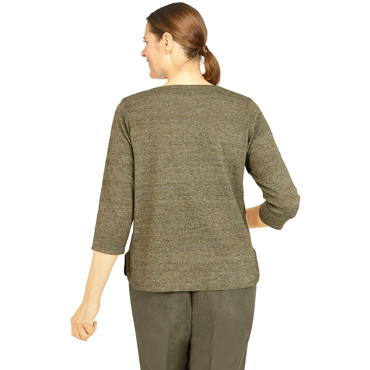 A dramatic color block pattern is feminized with a mix of pointelle stitches. This Womens Alfred Dunner Copper Canyon collection textured color block soft heather sweater features 3/4 sleeves, a shirttail hemline, and accents of beads.
