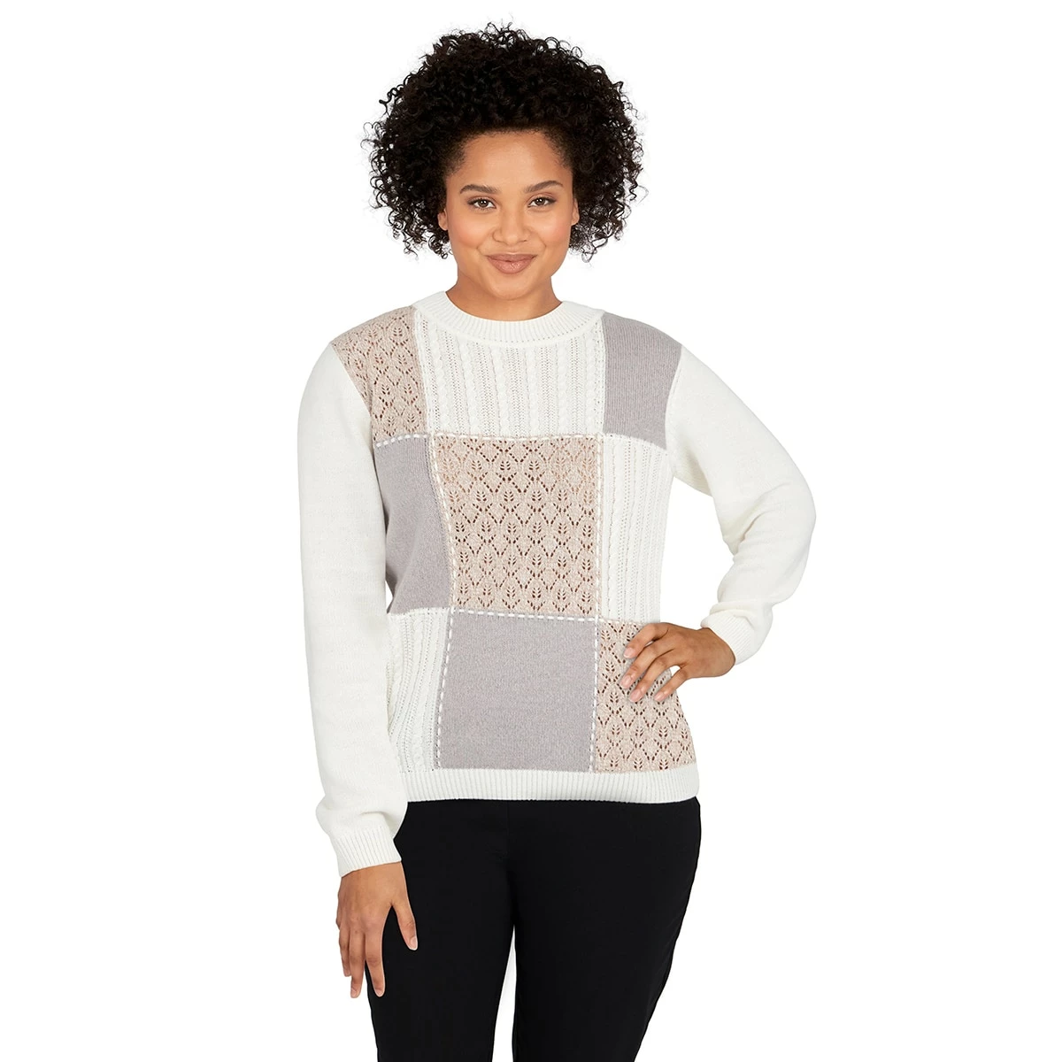 The Womens Alfred Dunner Stonehenge pointelle color block sweater has just the right feminine touches. Features long sleeves, ribbed trim, and a crew neckline.