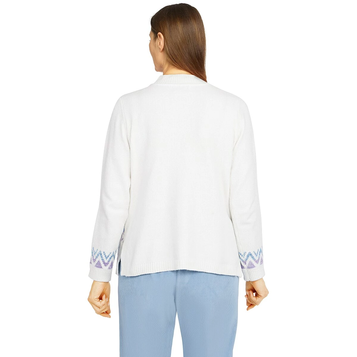 We updated our Womens Alfred Dunner Victoria Falls classic fair isle pattern to add a feminine appeal to our chenille sweater. Features 3/4 sleeves and a mock neckline.