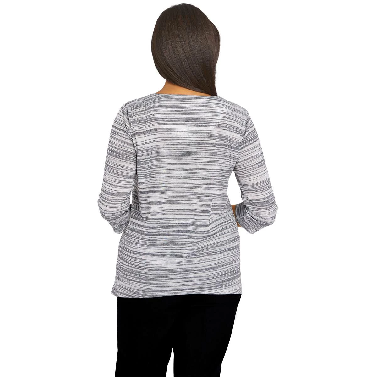 Stay fashionable in this Petite Alfred Dunner Checking In scroll space knit blouse.