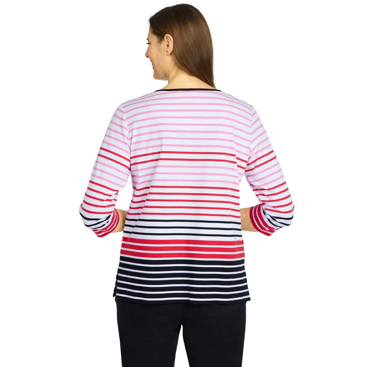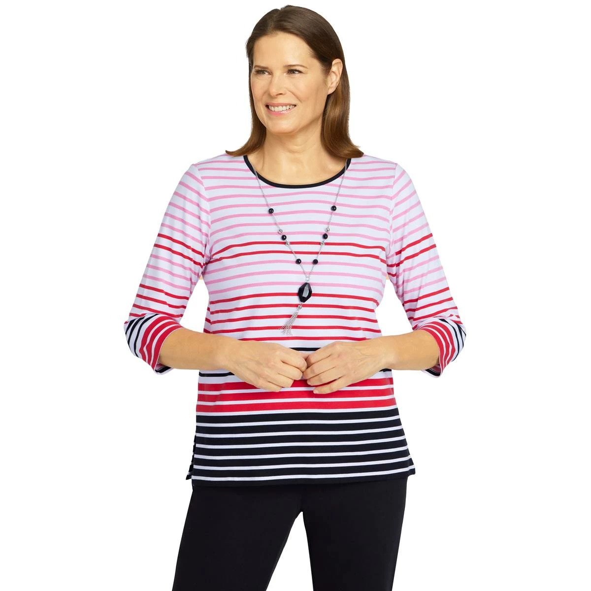 Three cheers for this red, white and blue Petite Alfred Dunner Checking In border stripe top.