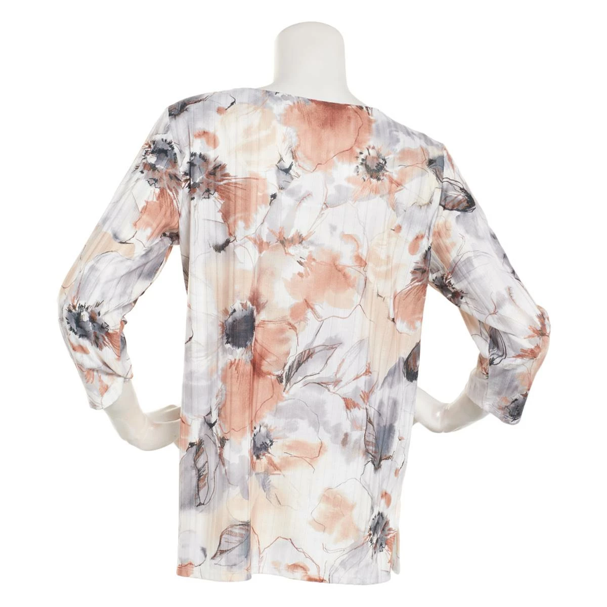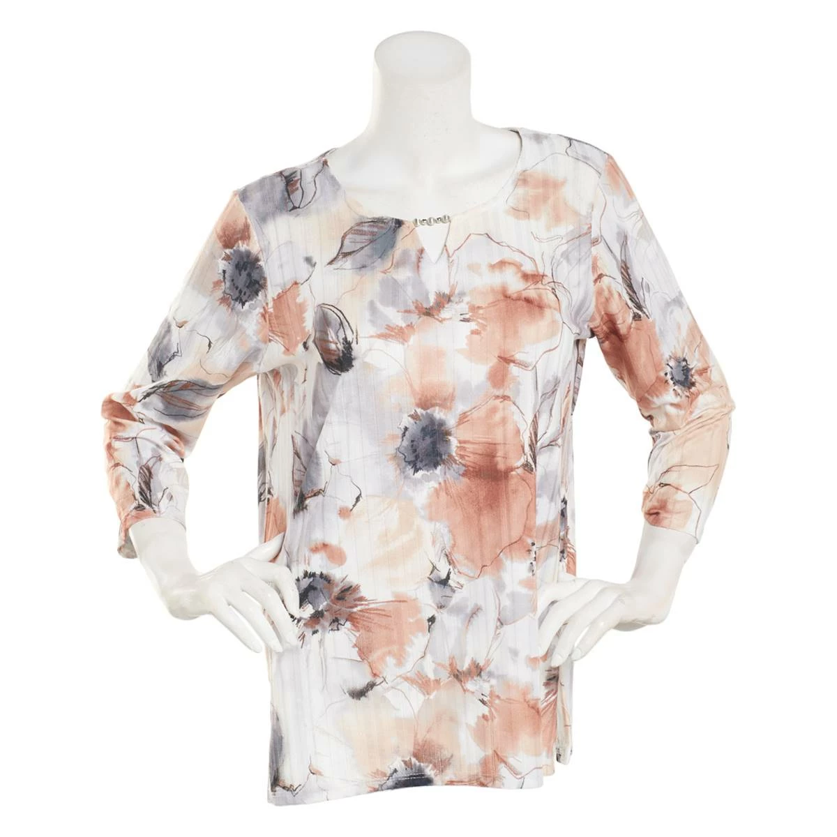 Complete your casual look with this Petite Alfred Dunner Classics watercolor floral printed top. This pretty tee features a round neckline and 3/4 sleeves.
