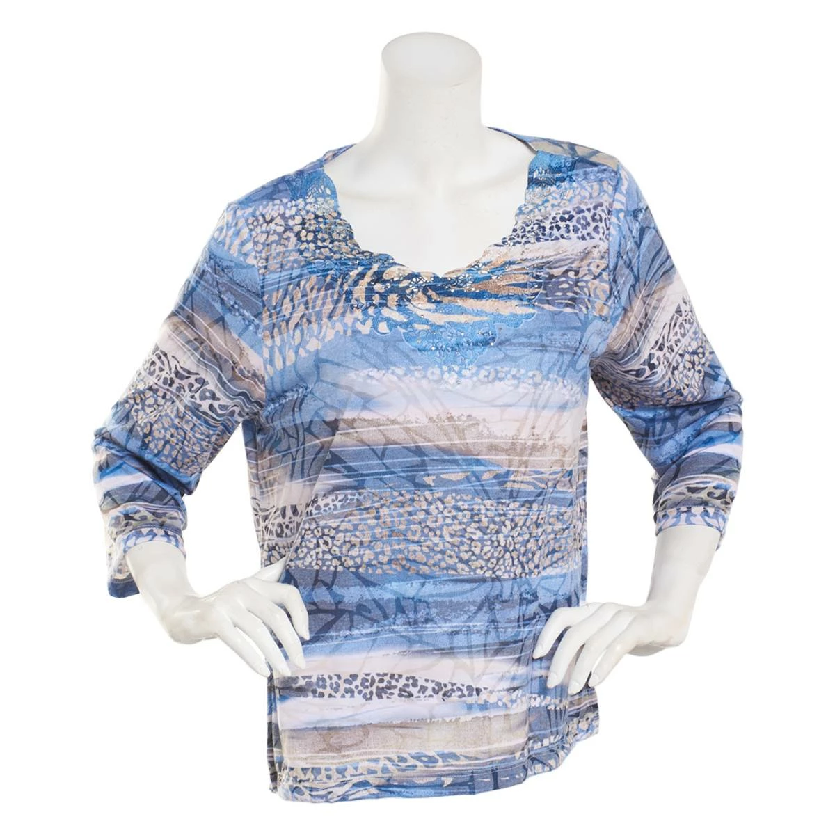 Maximize your trendy fashion with this Petite Alfred Dunner Classics animal biadere burnout printed top. Features a round neckline with lace and rhinestones and 3/4 sleeves.