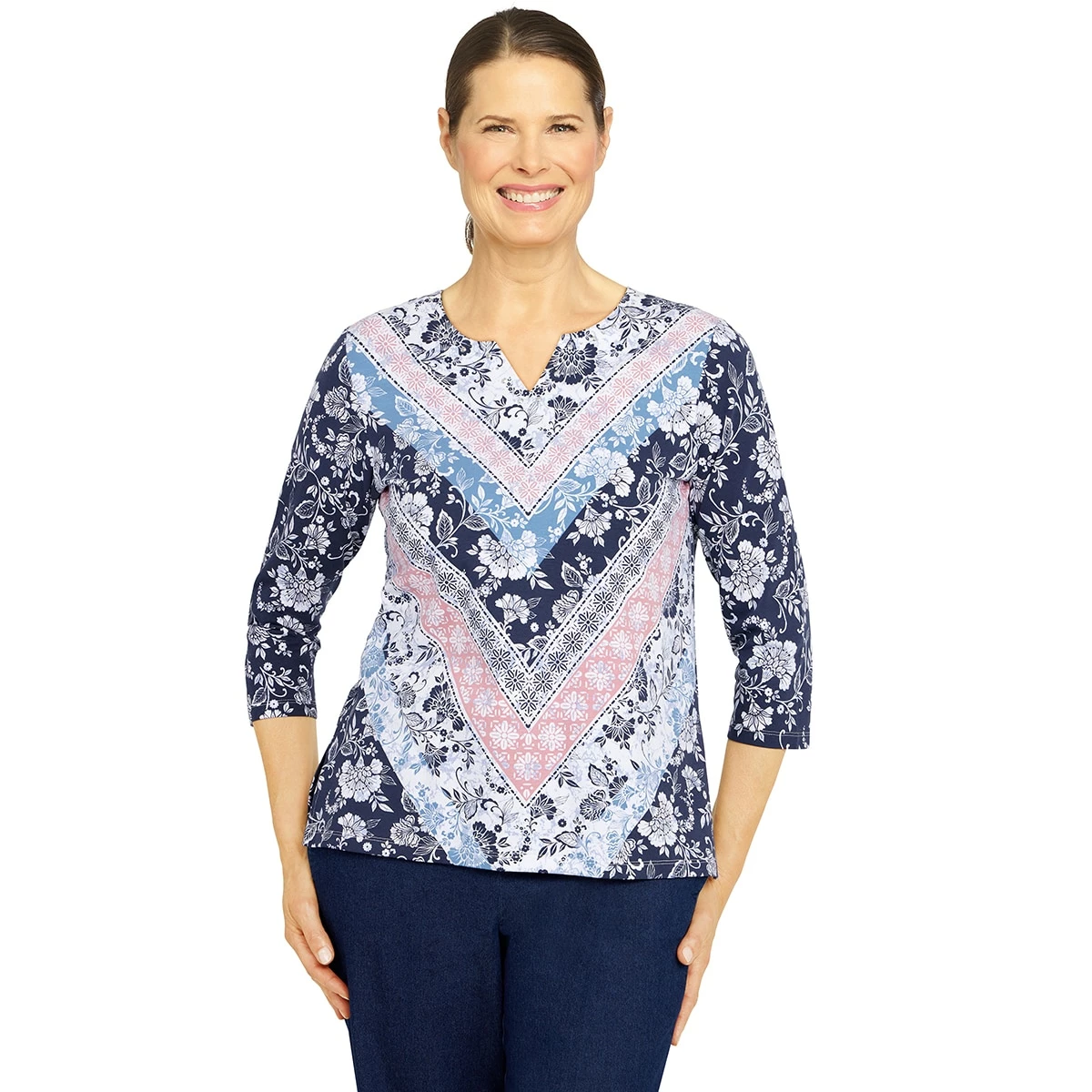 Stunning floral scrolls create a modern chevron print on our Petite Alfred Dunner Shenandoah Valley soft knit top. Features 3/4 sleeves and a lightly embellished v neckline.