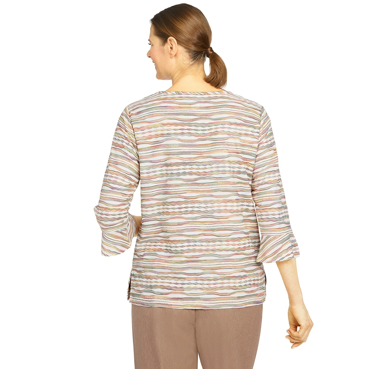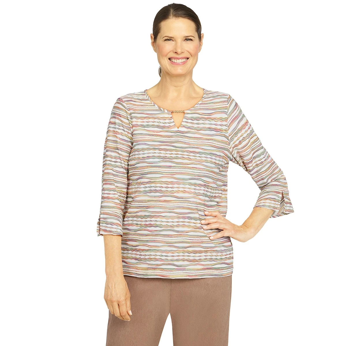 This Petite Alfred Dunner Stonehedge cozy chenille top is the perfect style to add to your Fall wardrobe. Features 3/4 sleeves and a detachable necklace at the crew neck.
