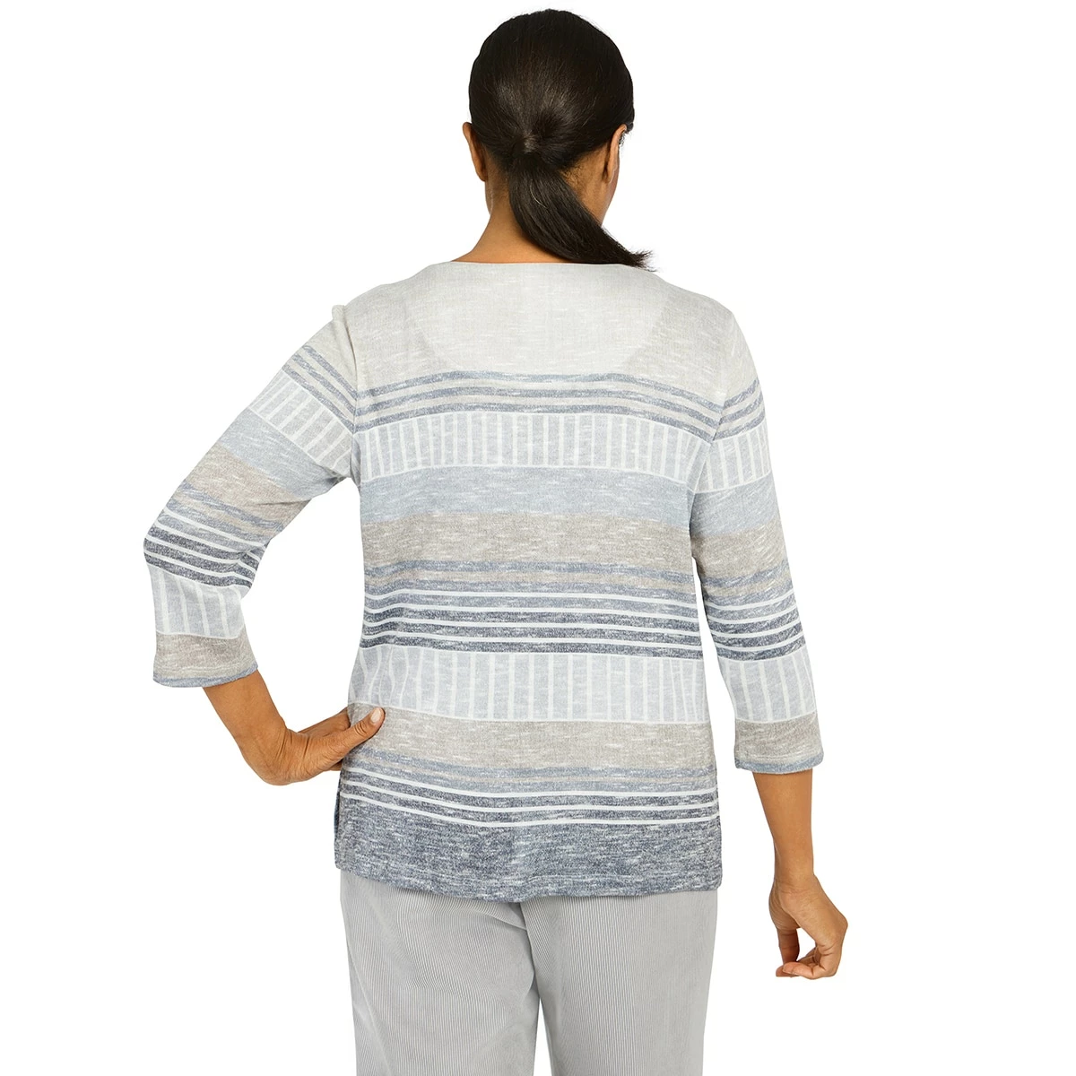 The interesting tonal stripe pattern and mΓ©lange fabric enhance this Petite Alfred Dunner Stonehenge lightweight knit top. Features 3/4 sleeves and an embellished crew neckline.