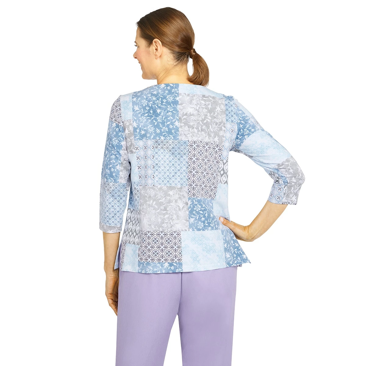 Patch up your look with this Petite Alfred Dunner Victoria Falls monotone print knit blouse. Features 3/4 sleeves and an embellished pintuck crew neck.