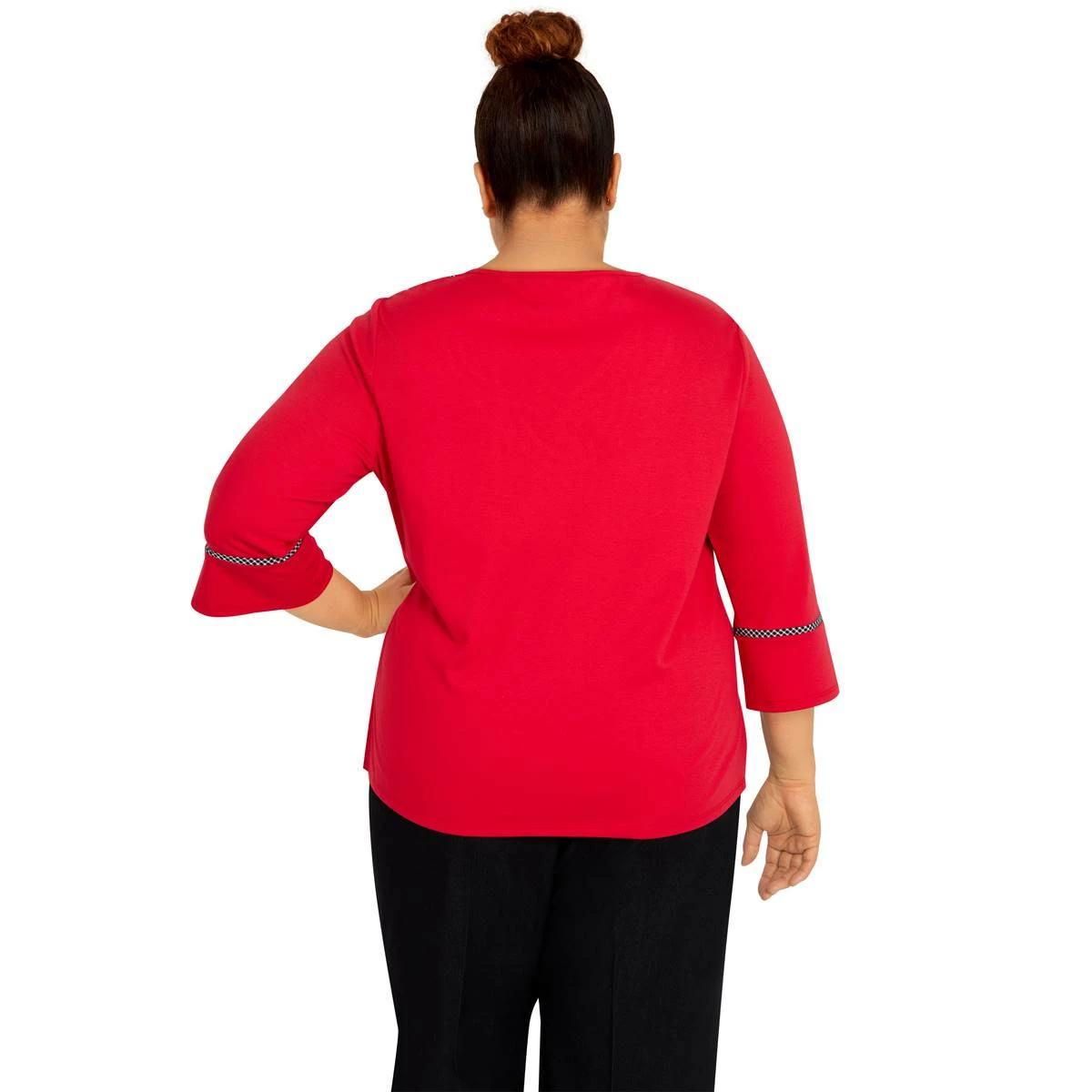 Beautiful, intricate scroll embroidery feminizes this Plus size Alfred Dunner Checking In Check scroll knit blouse.