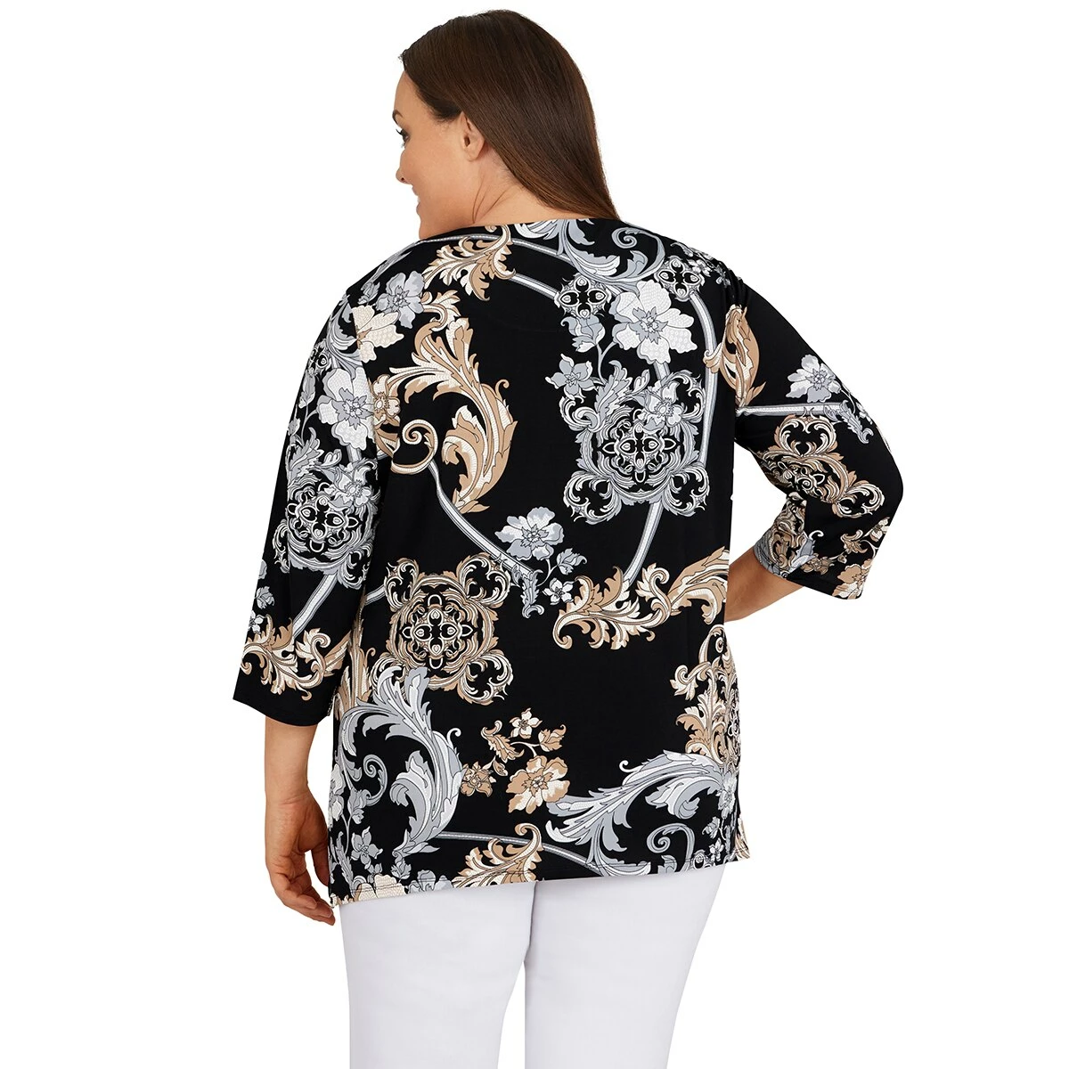 Scroll through pretty florals on our Plus Size Alfred Dunner Classics floral scroll puff print knit top. Fashioned with a shark bite hem, and a modern detachable necklace at the crewneck. Accessorize the removable necklace with all your favorite tops.