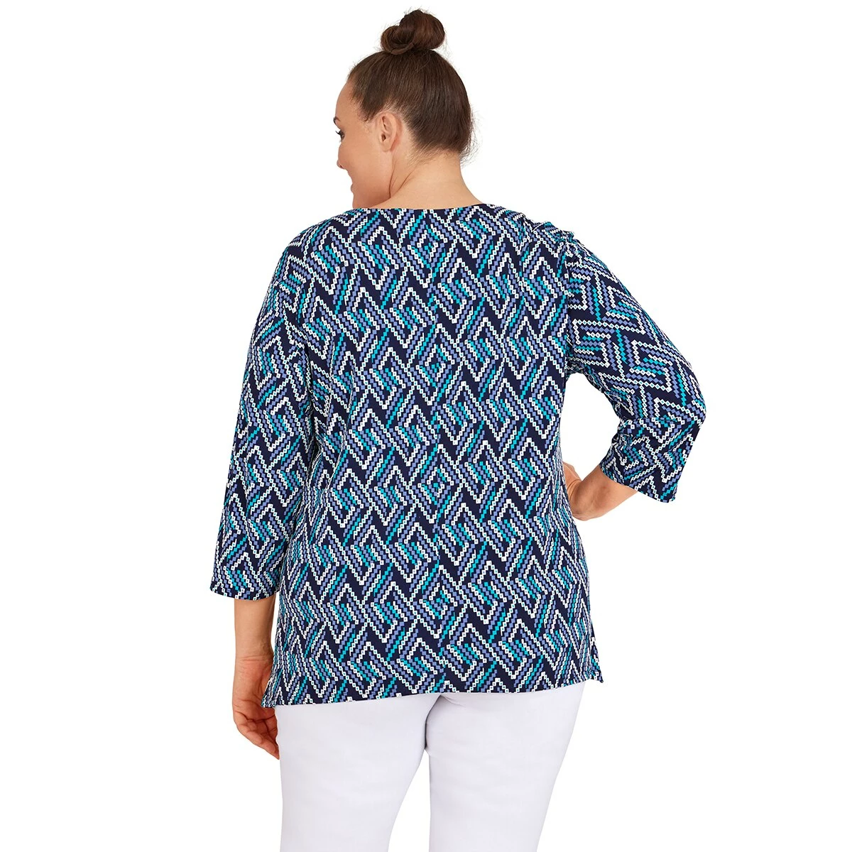 Modernize your look with our Plus Size Alfred Dunner geometric puff print knit blouse. This easy wear style features a shark bite hem and a detachable necklace. Accessorize the removable necklace with all your favorite tops.