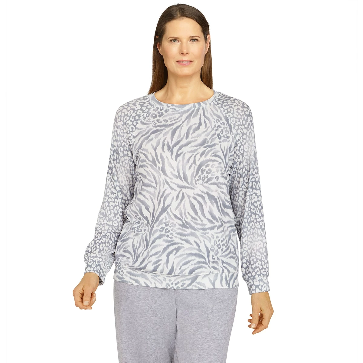 Our Plus size Alfred Dunner floral park monotone mixed animal print top is just right for exercise, errands, or relaxing at home. Features raglan sleeves and a crew neckline.
