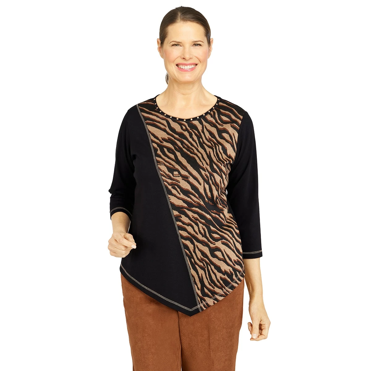 The Plus Size Alfred Dunner Madagascar spliced tiger jacquard knit blouse features a round neckline and long sleeves with a v shape hemline. Perfect with your favorite bottom.