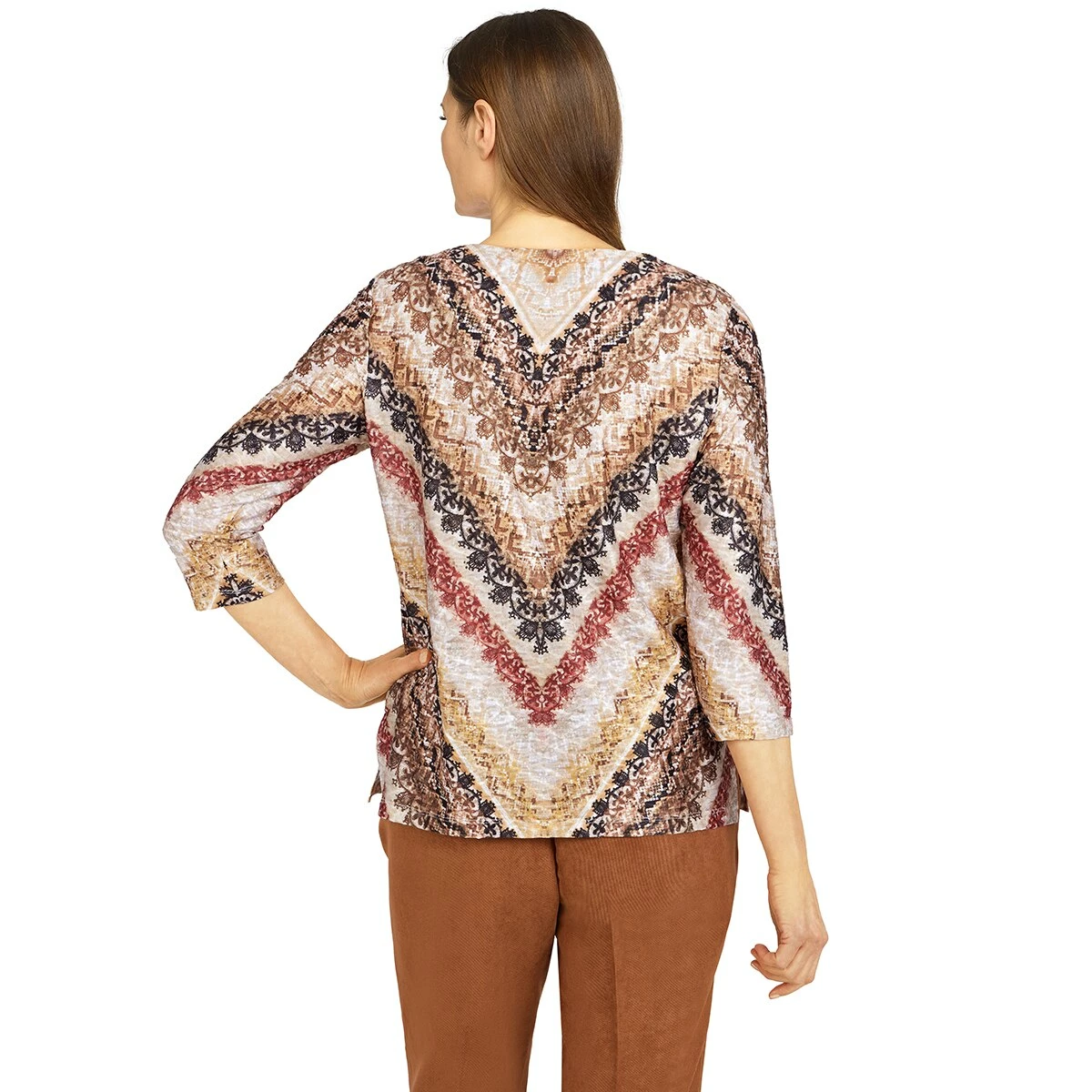 Liven up your style by wearing this Plus Size Alfred Dunner Madagascar textured python chevron knit blouse that features a crew neckline and 3/4 sleeves.