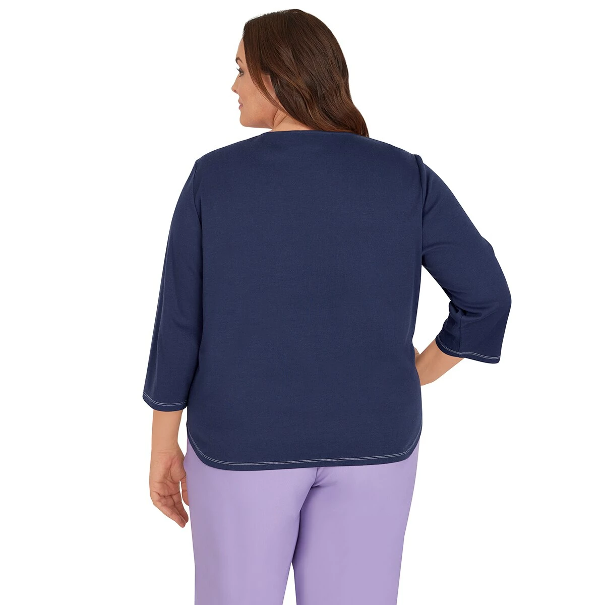 Fun, two-toned embroidered floral neckline and patterns add a bohemian touch to this Plus Size Alfred Dunner Picture Perfect knit top. This top features a shirttail hemline, and embroidered scoop neckline.