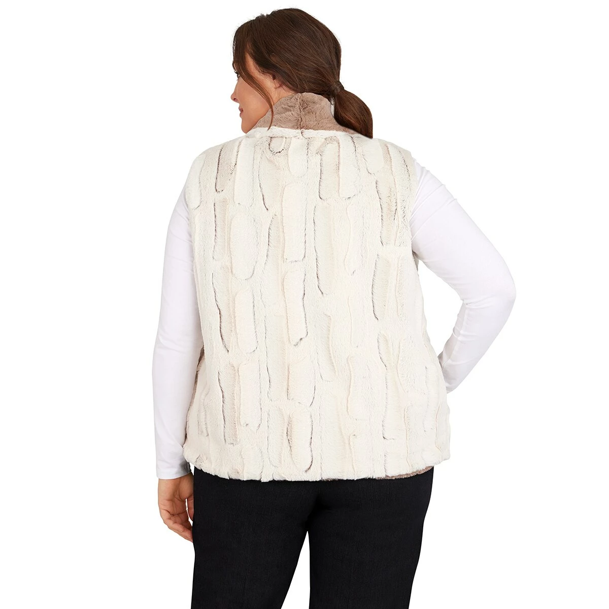 Look and feel luxurious in this Plus Size Alfred Dunner Stonehenge features a reversible, contrasting colored, faux fur vest.