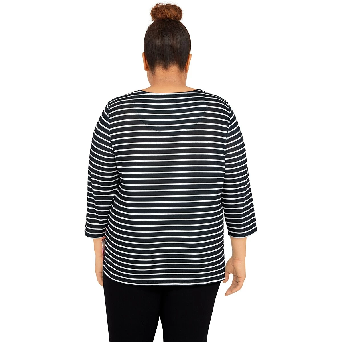 Gorgeous blooming florals on a contrast stripe ground easily pops the print on our Plus Size Alfred Dunner Theater District knit top. Features 3/4 sleeves and subtle beading at the crewneck.