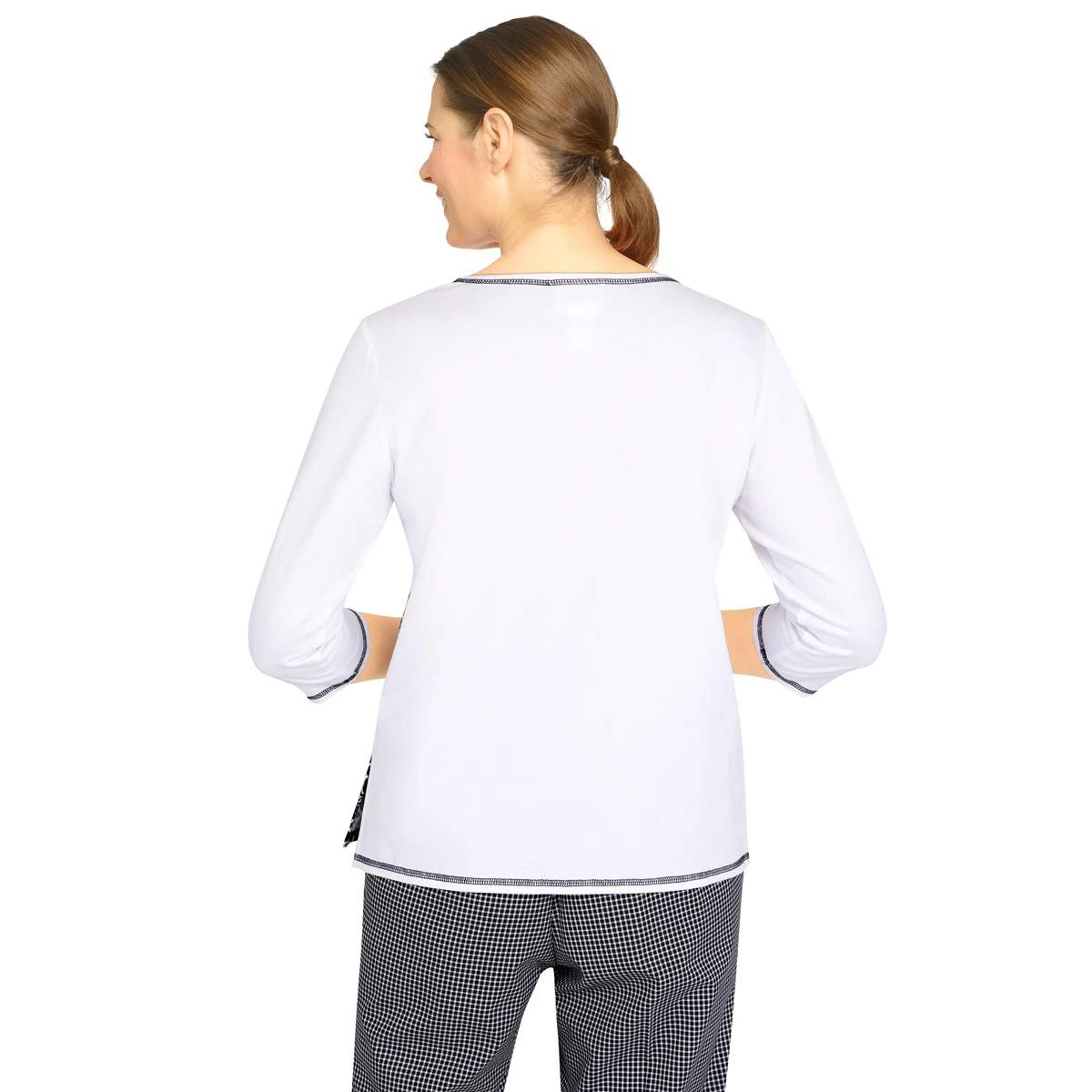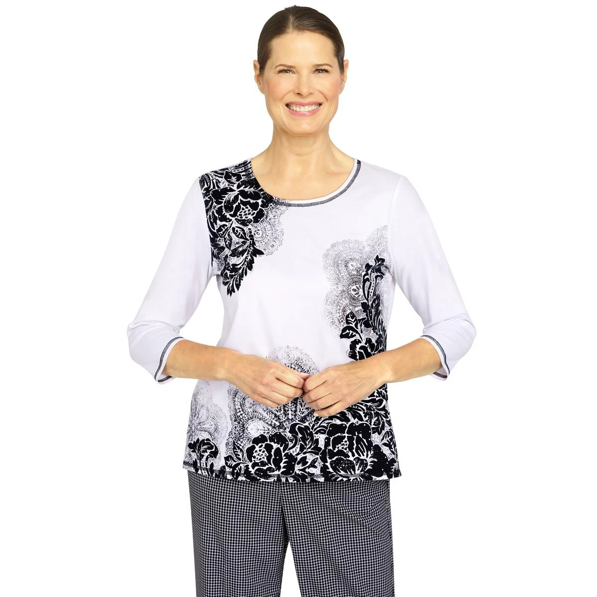 Our Womens Alfred Dunner Checking In floral top is exactly what you’ve been looking for. This gorgeous knit top is fashioned with delicate lace.