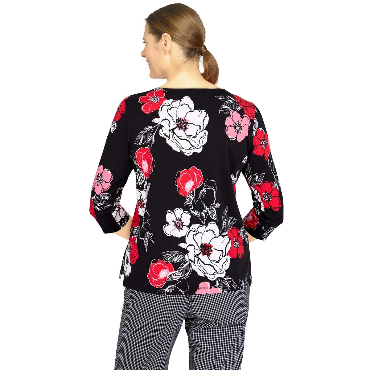 A pretty beaded-neck detail complements the large floral prints on this Womens Alfred Dunner Checking In floral bouquet knit blouse.