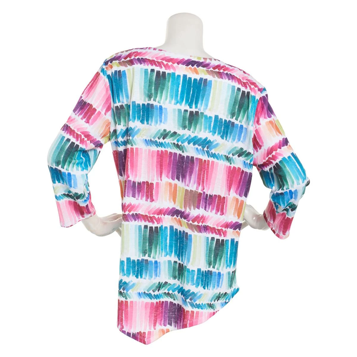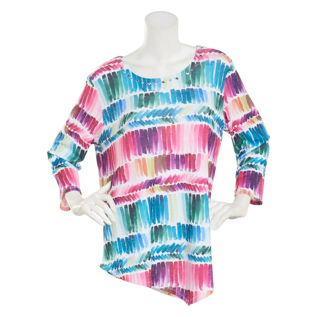 Tap into your stylish side with this Womens Alfred Dunner Classics brushstrokes printed top that features embellished stones around the round neckline and long sleeves.