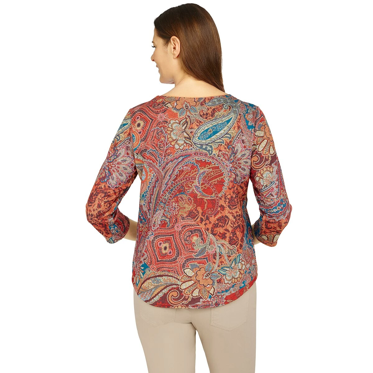 This Womens Alfred Dunner Copper Canyon collection colorful paisley print charms this soft heather knit top. Features a shirttail hemline and a detachable necklace at the crew neck.