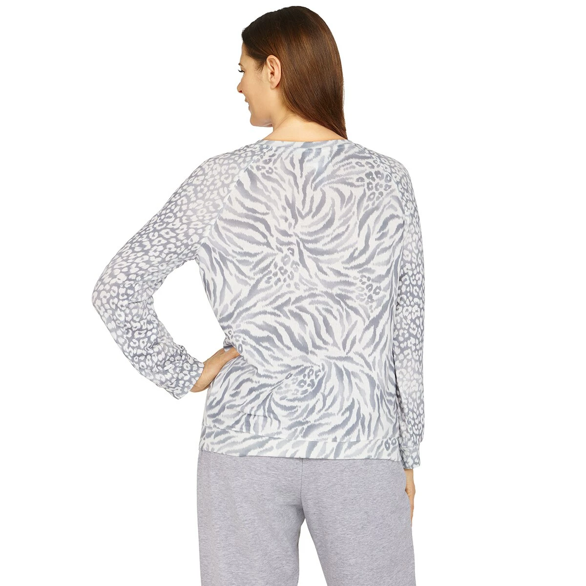 Our Womens Alfred Dunner floral park monotone mixed animal print top is just right for exercise, errands, or relaxing at home. Features raglan sleeves and a crew neckline.