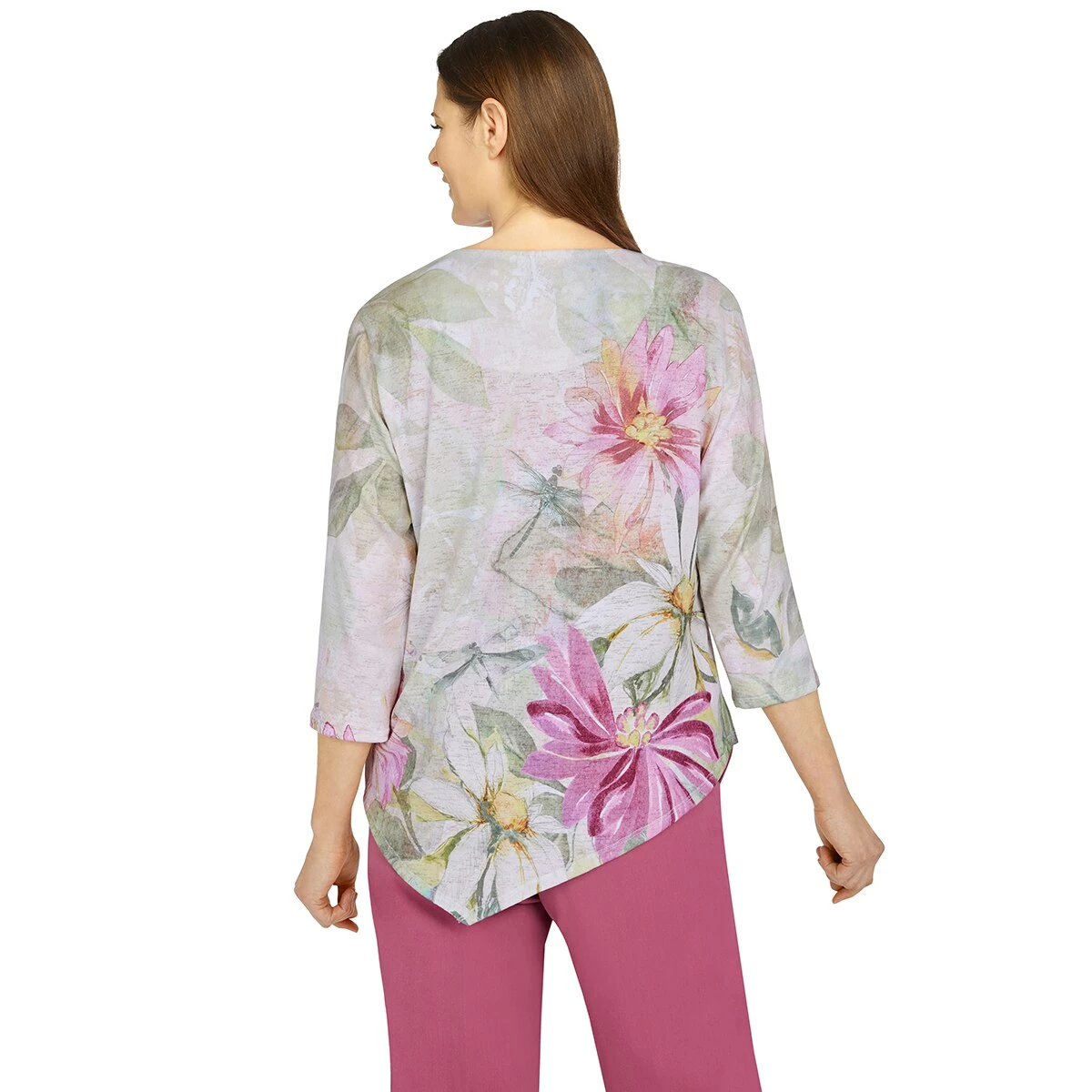 Our Womens Alfred Dunner Palm Desert dramatic floral print top is a staple for every wardrobe. This 3/4 length sleeve knit style features a flattering asymmetrical hemline and subtle embellishments at the crewneck.