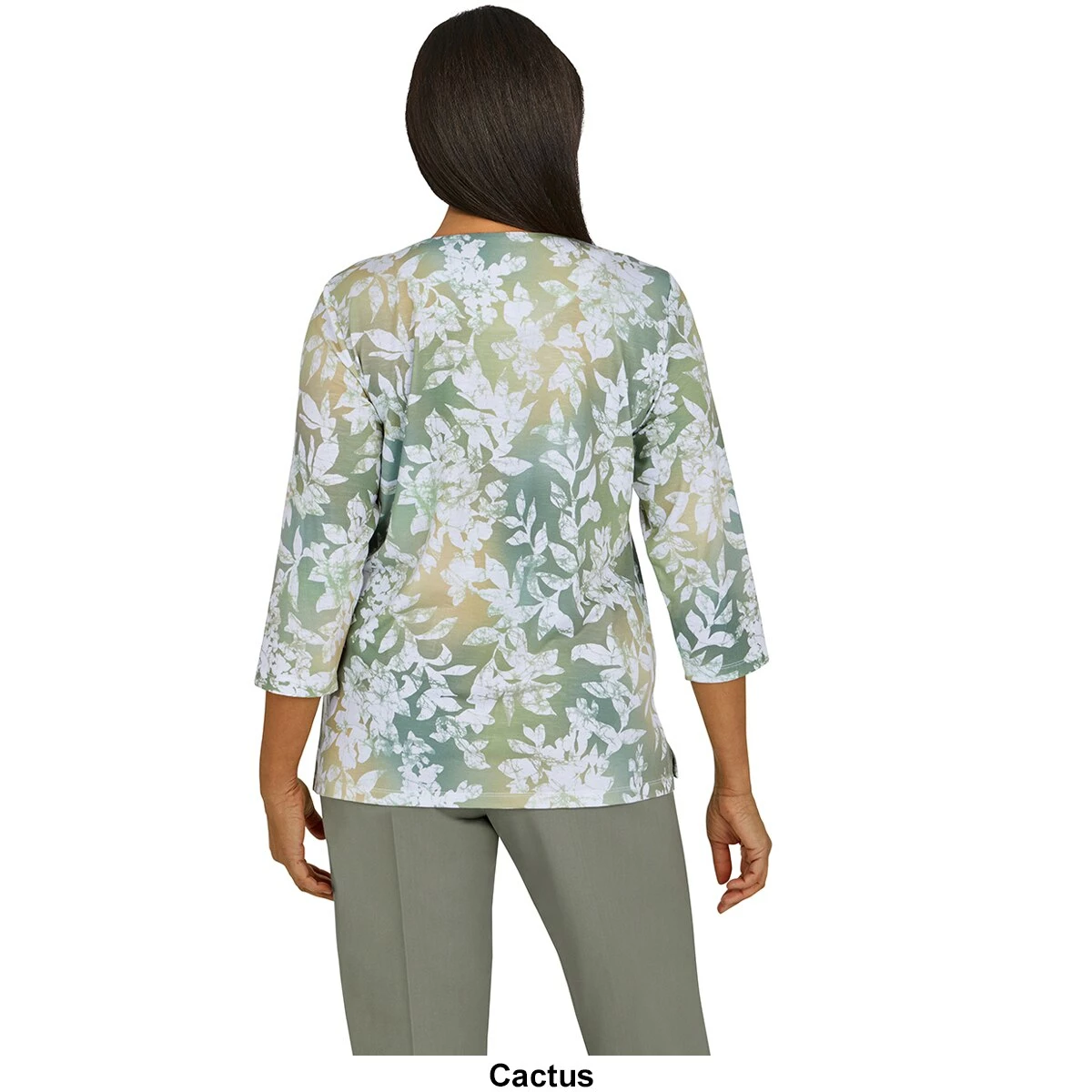 Update your look with our Womens Alfred Dunner Palm Desert woodblock floral print top. Pretty embellishments highlight the pintuck crewneck on this 3/4 length sleeve style.