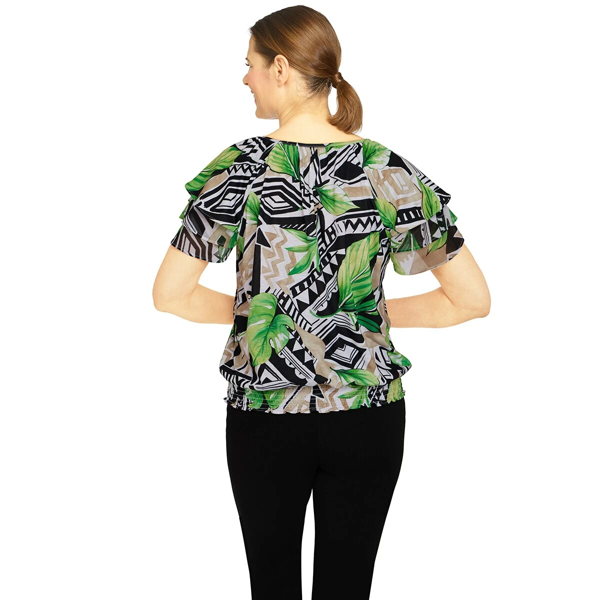 Our Womens Alfred Dunner Second Nature tropical geometric knit blouse is the modern style you’ve been looking for! This soft knit top features a soft v-neck shape, a trendy smocked hem, and sheer woven trim at the flutter sleeves.