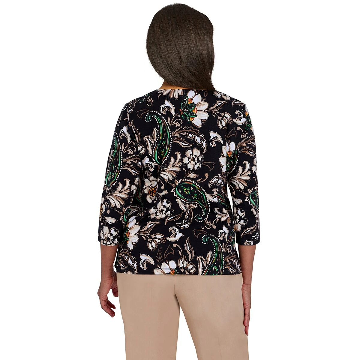 Take the Womens Alfred Dunner Second Nature paisley floral chevron print top from work into the weekend. This easy knit style is designed with a split neckline and 3/4 sleeves.