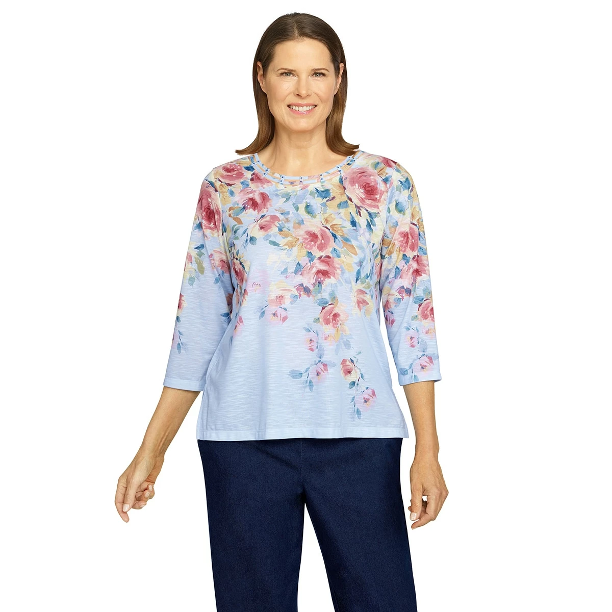 Our Womens Alfred Dunner Shenandoah Valley stunning floral print top will brighten any day. Features 3/4 sleeves and double strap detail at the round neckline.