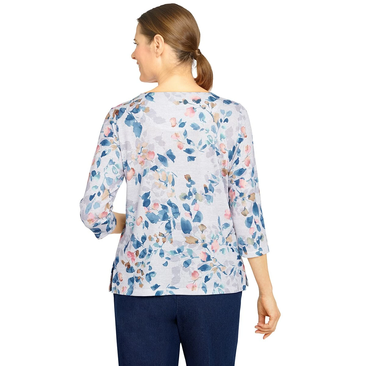 Our Womens Alfred Dunner Shenandoah Valley mΓ©lange knit top is designed with an eye-catching shadow leaf print. Features 3/4 sleeves and an embellished crewneck.
