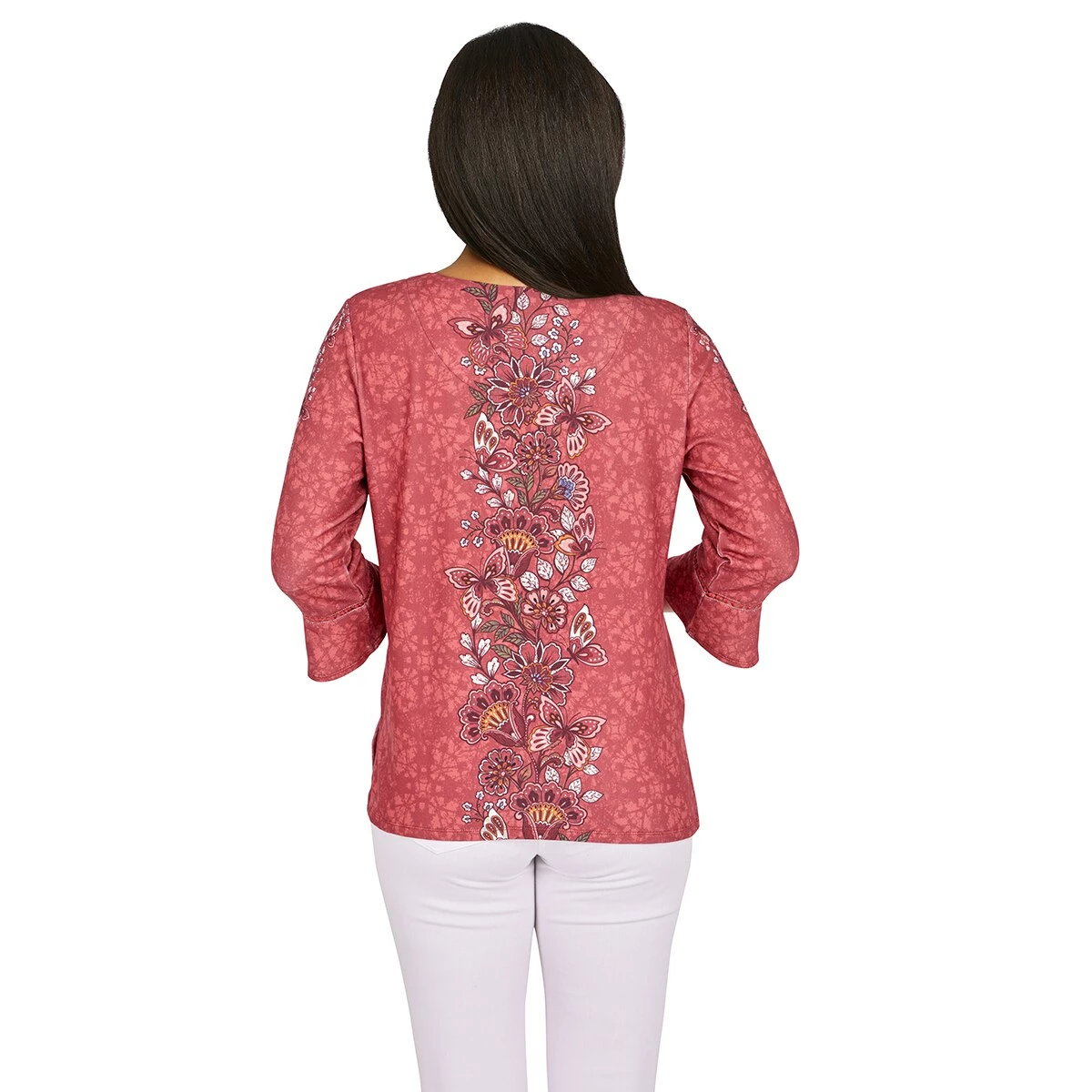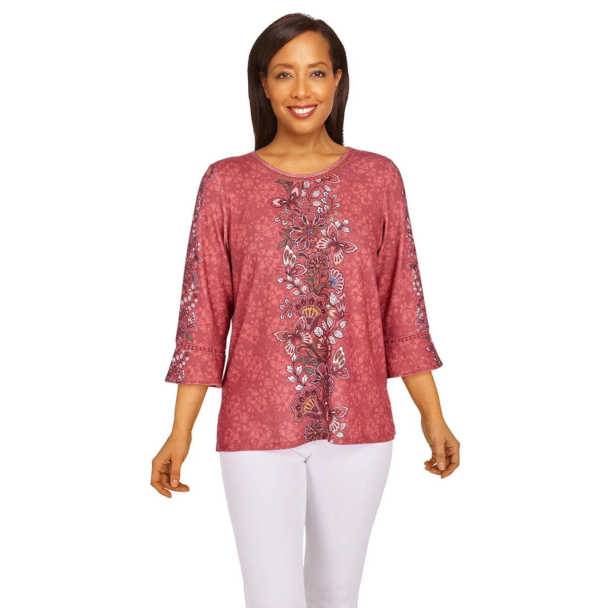 Keep your closet updated in our floral texture print Womens Alfred Dunner Sorrento blouse. This silky knit top features a delicate lace inset at the crewneck and 3/4 bell sleeves.