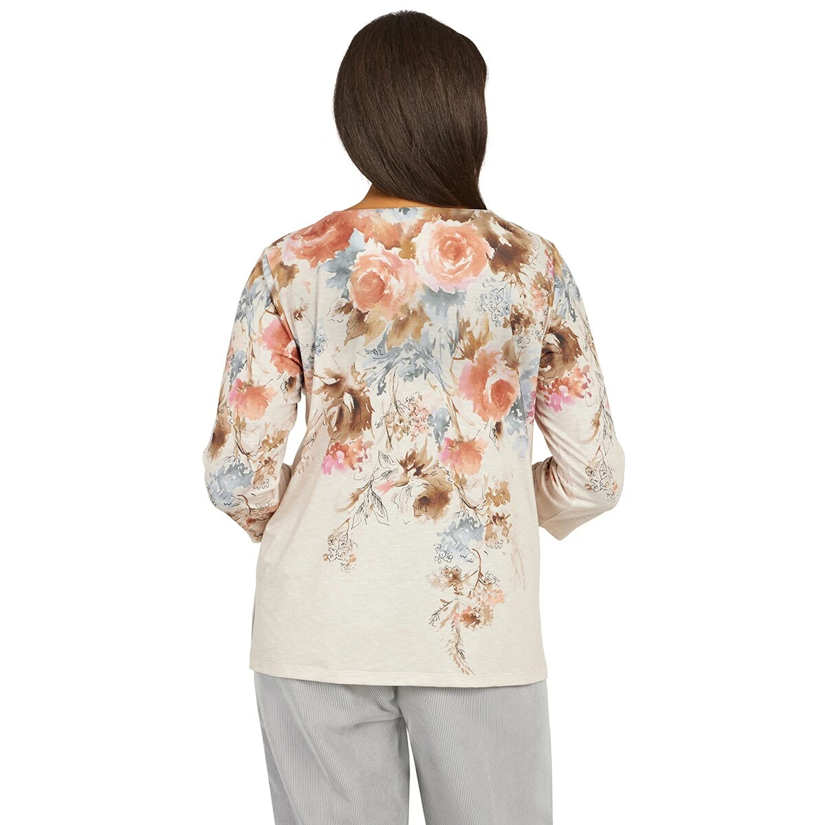 The Womens Alfred Dunner Stonehenge watercolor floral yoke knit blouse. You’ll want to keep this beautiful watercolor floral print top in the front of your closet! Features 3/4 sleeves and a light embellished double strap detail at the crew neckline.