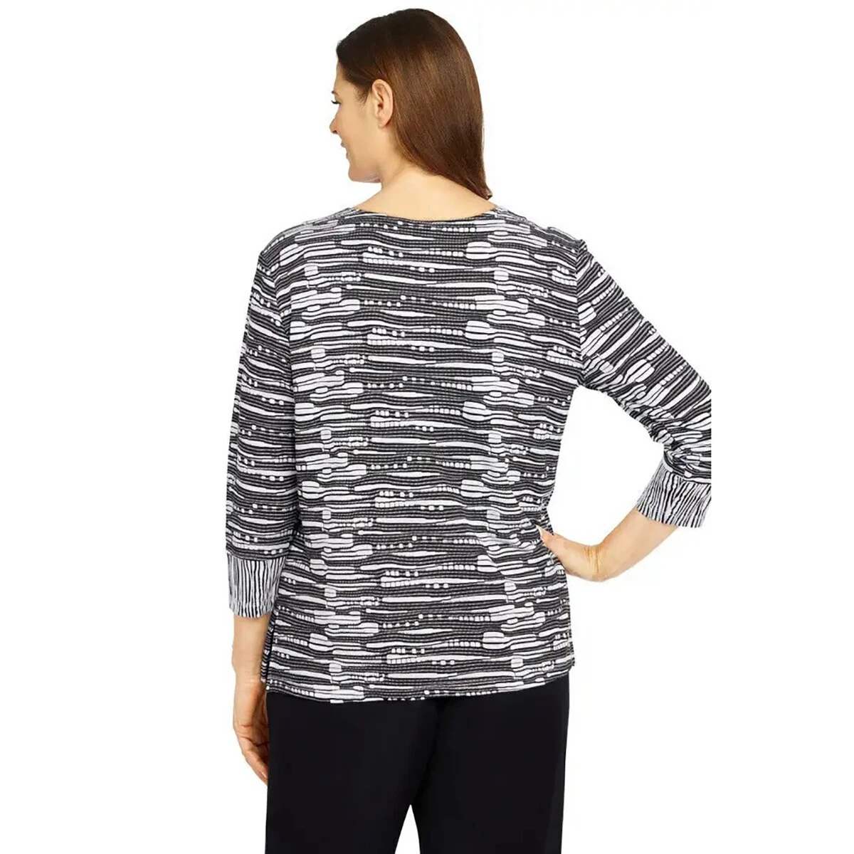 Our Womens Alfred Dunner Theater District soft knit top captures a unique spliced texture pattern in a trendy style. Features 3/4 sleeves and a beaded split neck.