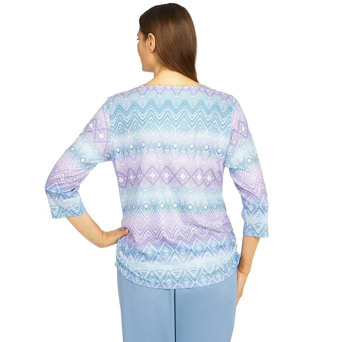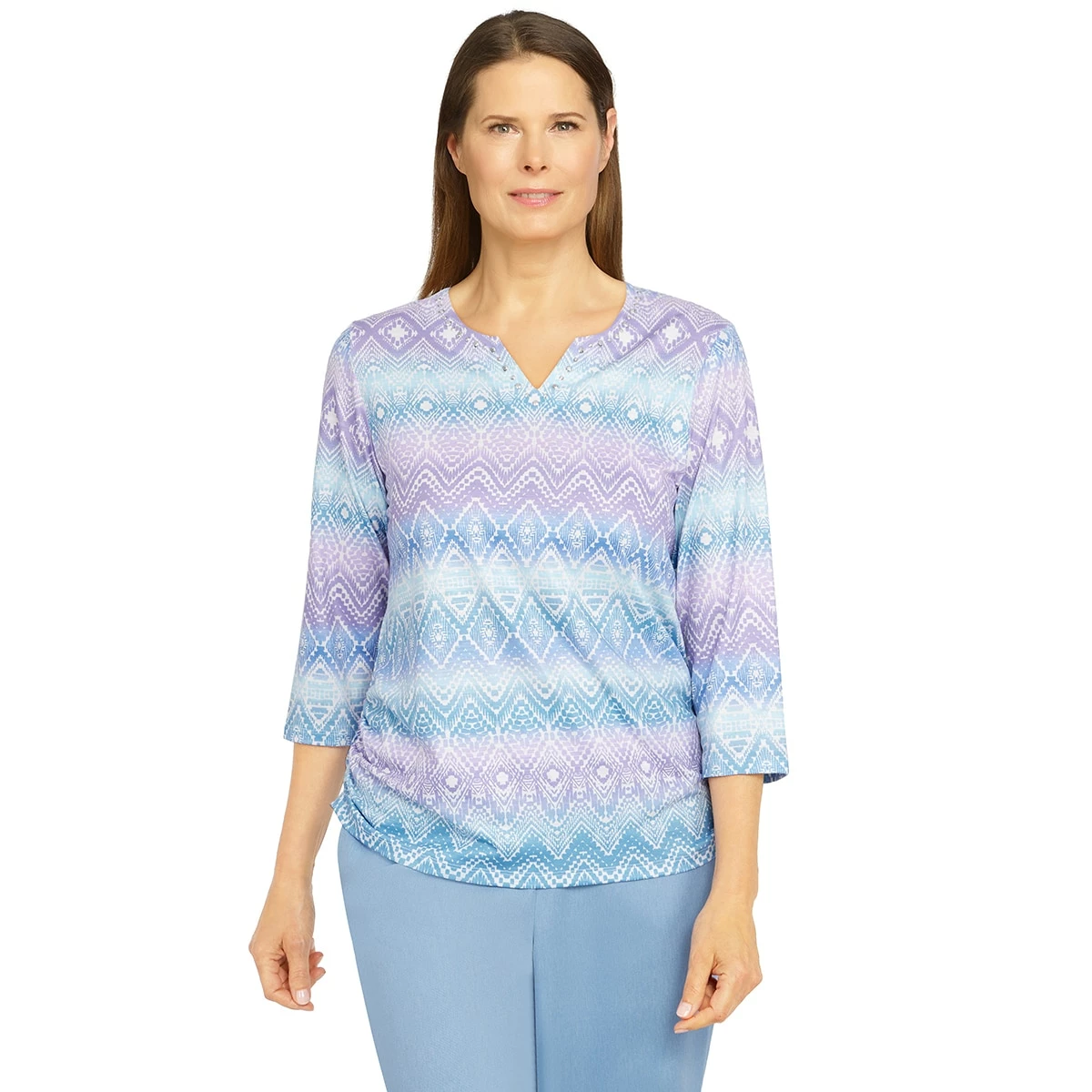 Our Womens Alfred Dunner Victoria Falls lovely soft knit top is designed in a diamond stripe pattern print. Features 3/4 sleeves, ruched sides at the shirttail hemline, and an embellished split neck.