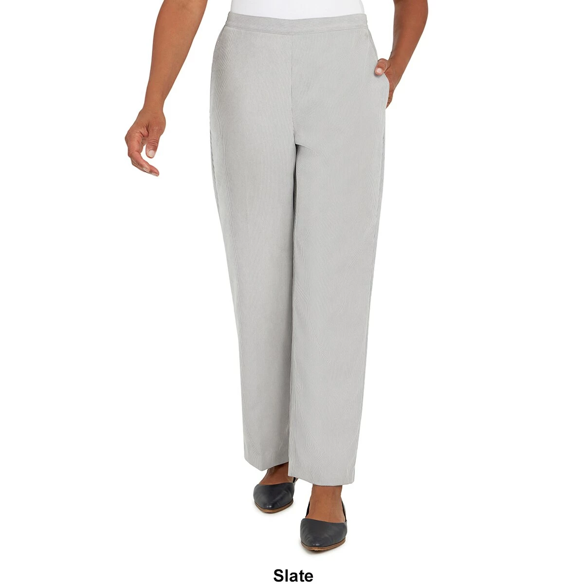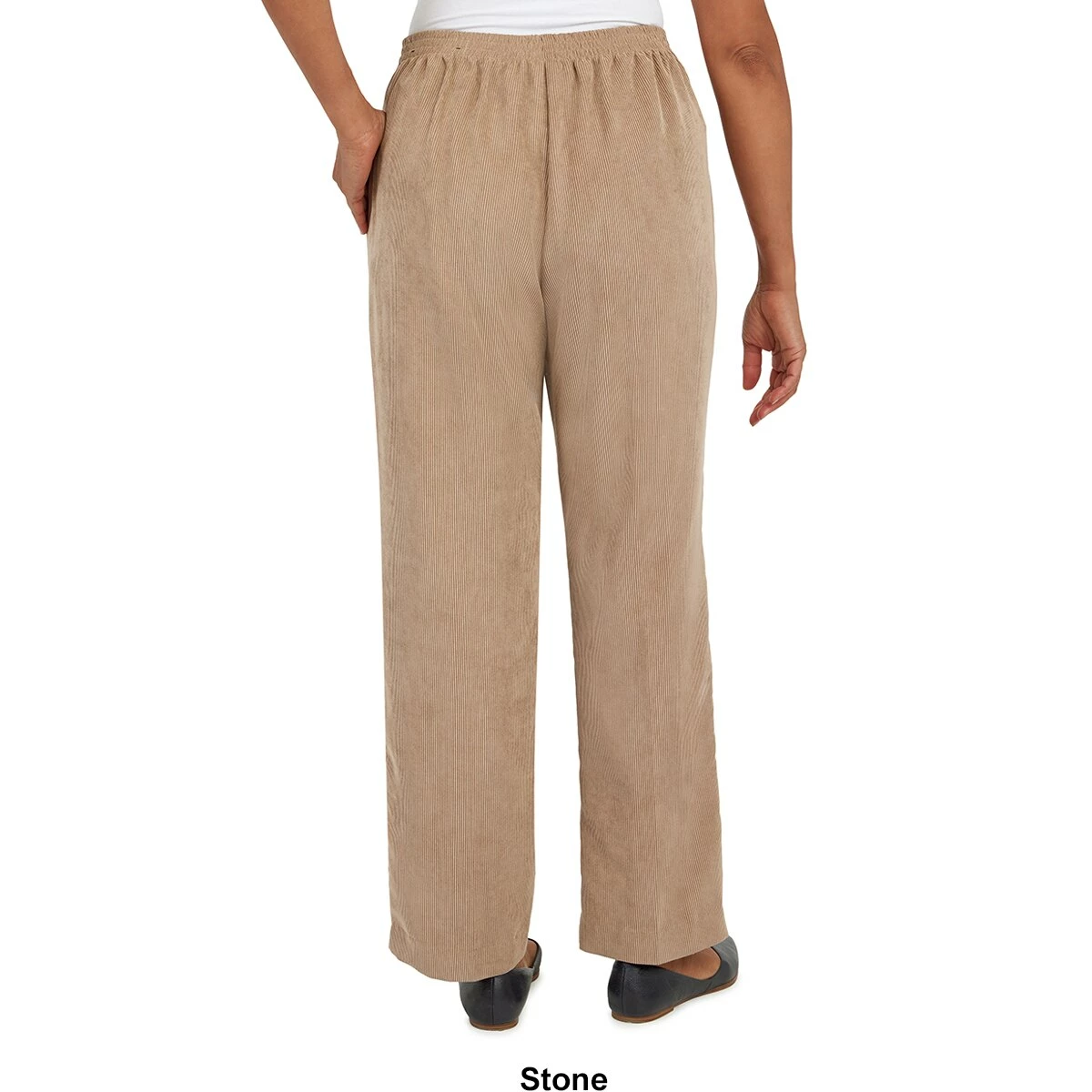 The Womens Alfred Dunner Stonehenge classic fit pant is designed in soft corduroy fabric with a flat-front waistband, elastic back, and side seam pockets.